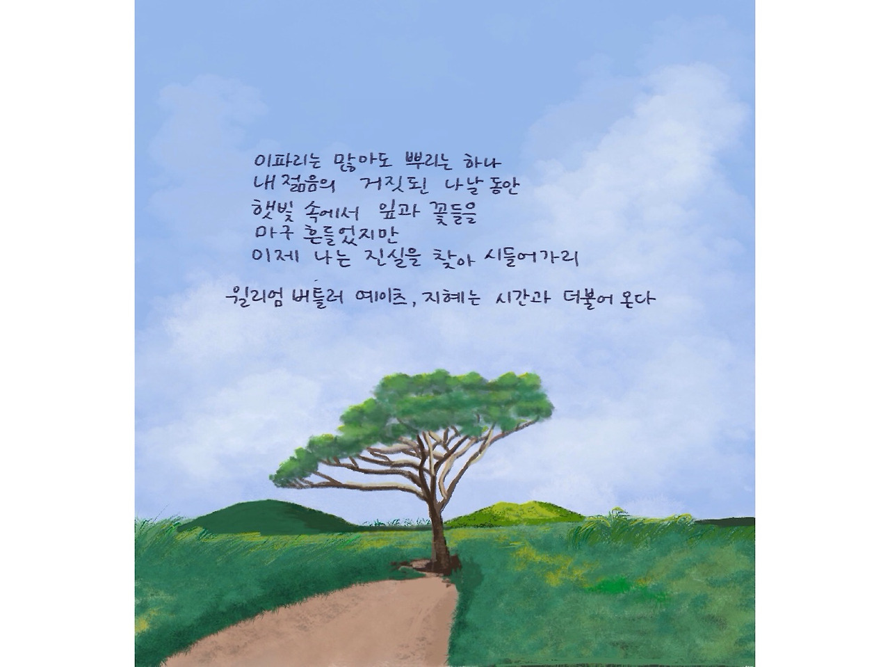 젊은 시절 햇빛 속에서 반짝이는 잎과 꽃들을 마구 흔들며 했던 노력과 시도와 때로는 원치 않던 거짓 타협들까지도 자부심과 오만함 안에서 용해되는 것이었지만, 세월이 지나 잎들과 꽃들이 떨어져 앙상하게 시들어 가는 때가 되어서는 뿌리 근본으로 들어가 진리를 새롭게 깨달아 간다는 시다.