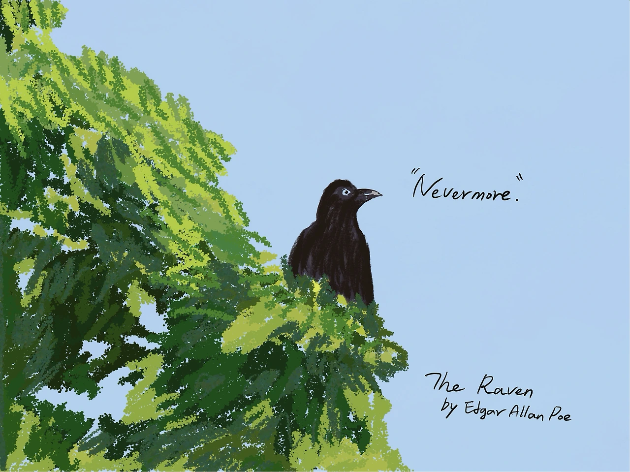 그리고 램프가 까마귀를 뒤에서 비춰 큰 그림자로 드리워져 앞으로 이 까마귀가 갈 것 같지 않고 화자의 영혼이 이 까마귀의 그림자에서 들어 올려지지 못할 거라는 암시 nevermore!로 끝난다.