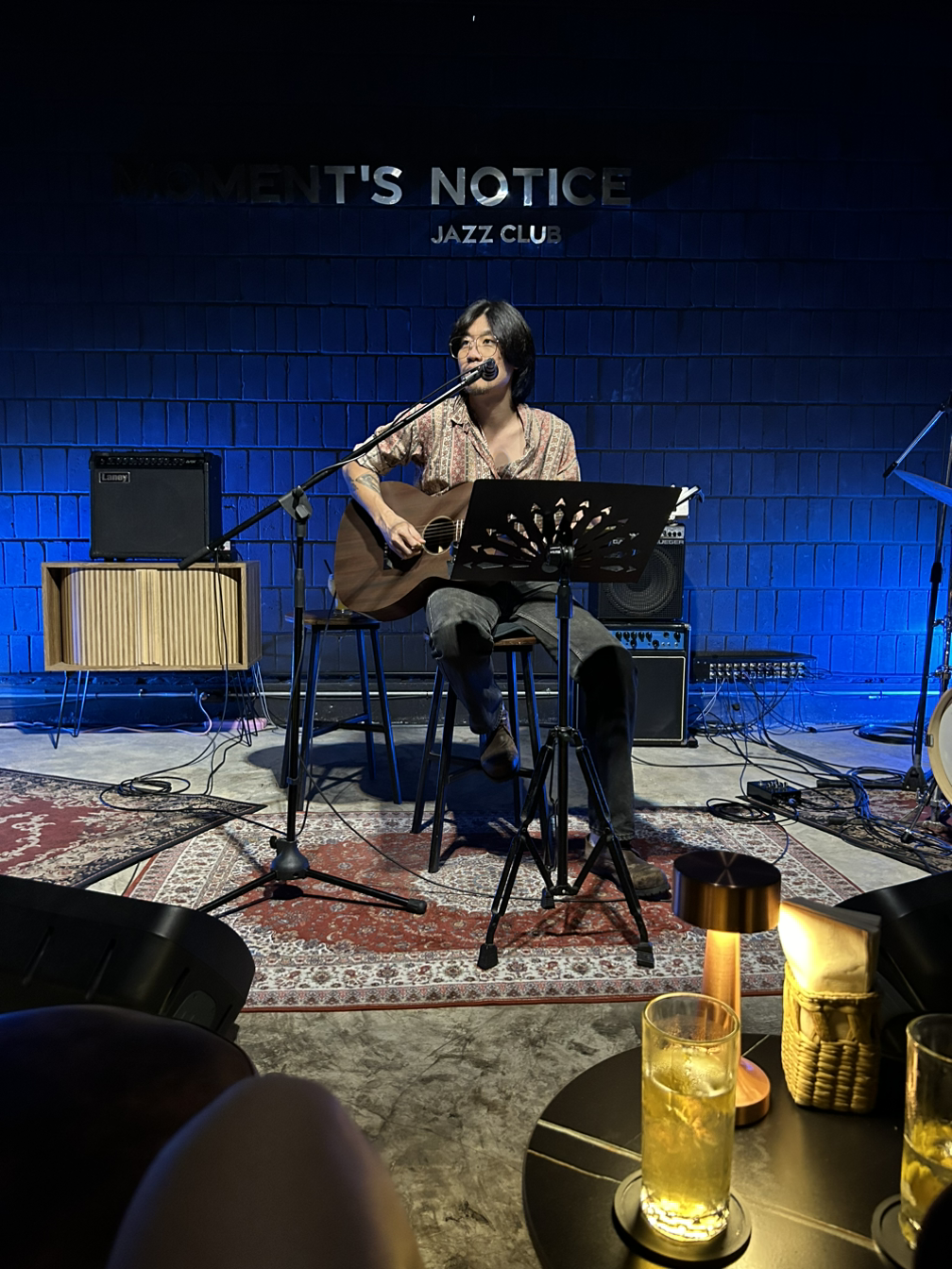 친구와 하이볼을 한 잔씩 시키고 아무도 없는 공간을 만끽하며 도란도란 이야기를 나누다 보니 어느새 공연이 시작됐다. 5:5로 갈라진 긴 장발에 얇은 금테 안경, 그리고 에스닉 셔츠까지 꼭 우리 아빠 젊을 적 패션과 비슷해 보였다. 그가 튕기는 기타 줄에 더해진 감미로운 목소리는 순식간에 우리의 오감을 사로잡았다.