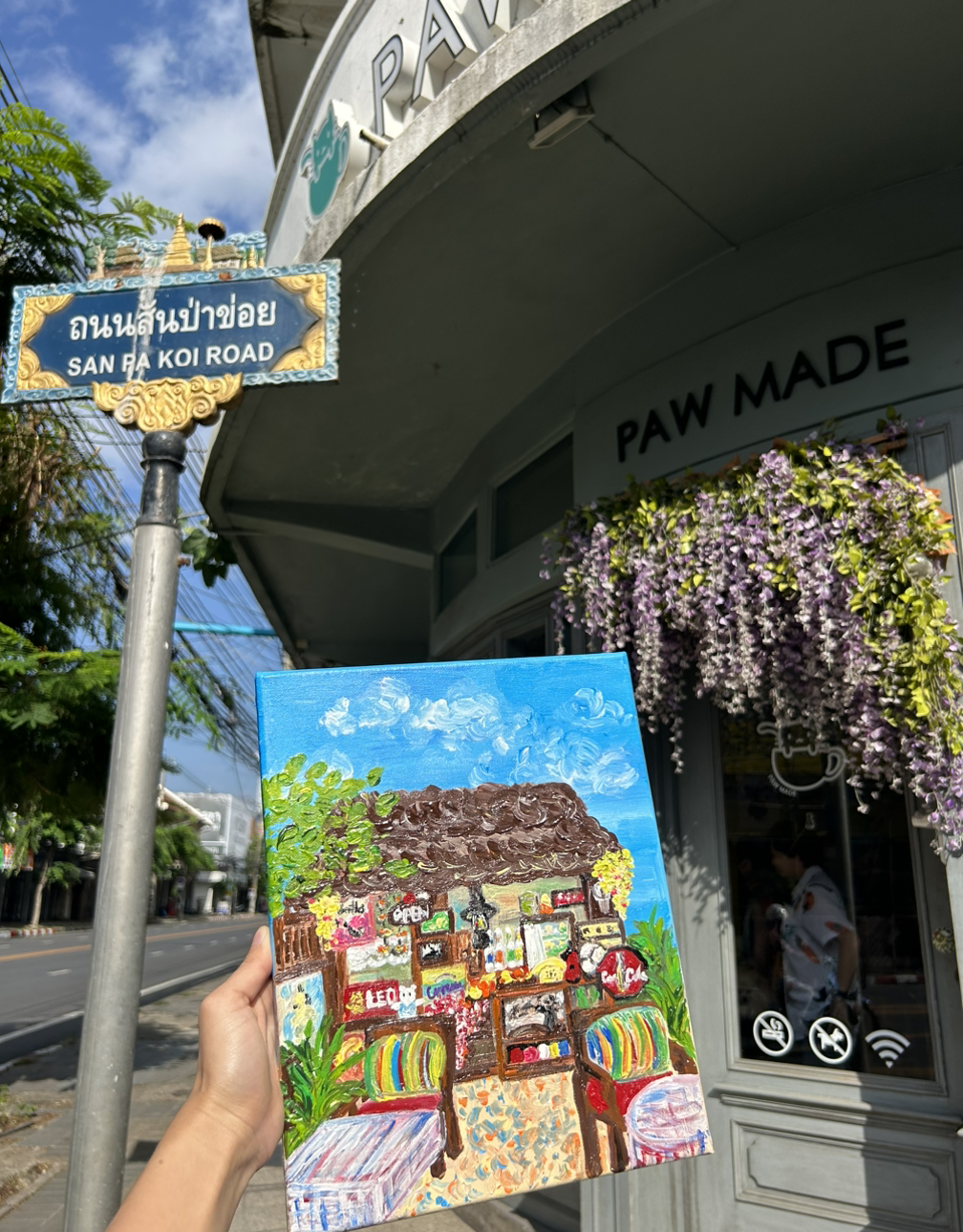이런 것을 예약하면 항상 고민되는 것이 무엇을 그릴까!이다. 나는 3주 정도의 여행을 돌아보며 그림으로 간직하고 싶은 장소를 골랐다. 수많은 고민 끝에 나는 여행 둘째 날 우연히 발견한 감성 스무디집으로, 친구는 빠이에서 본 녹차밭으로 정했다.