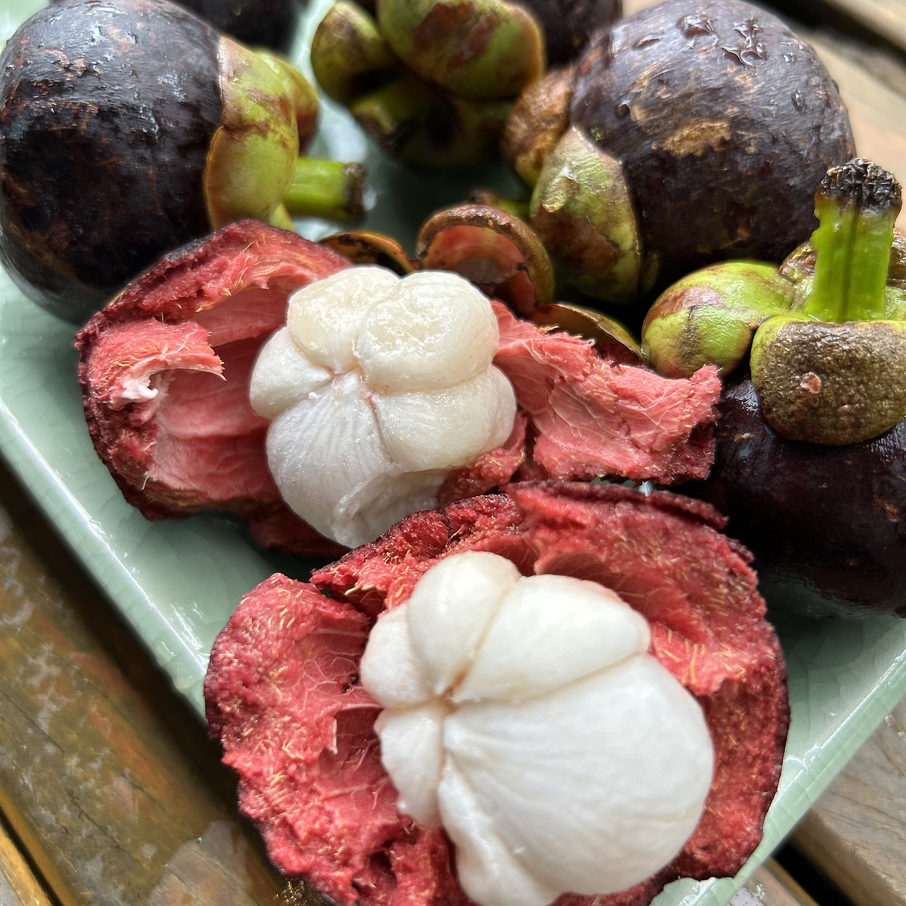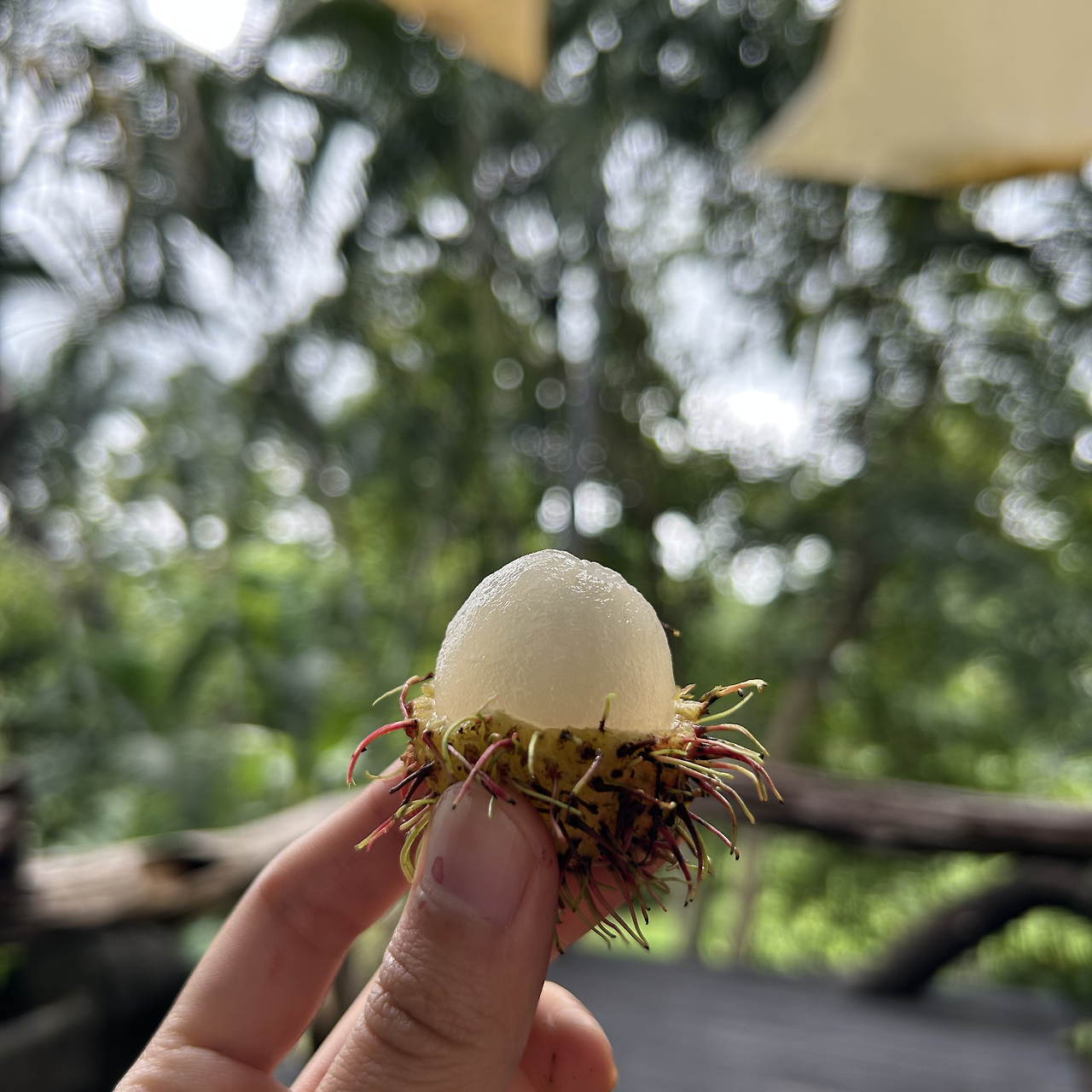우리는 다시 방갈로에 돌아와 어제 시장에서 사 온 과일을 까먹었다. 여기 와서 망고스틴과 뾰족한 갈색 동그라미 과일을 까는 방법을 익혔다. 먼저 망고스틴은 꼭지를 아래로 하게 한 다음 엄지를 사용하여 가로선을 그으며 꾹꾹 누른다. 그런 다음 모자를 벗기듯 위에 부분을 들어 올리면 뽀얀 속살이 나온다.