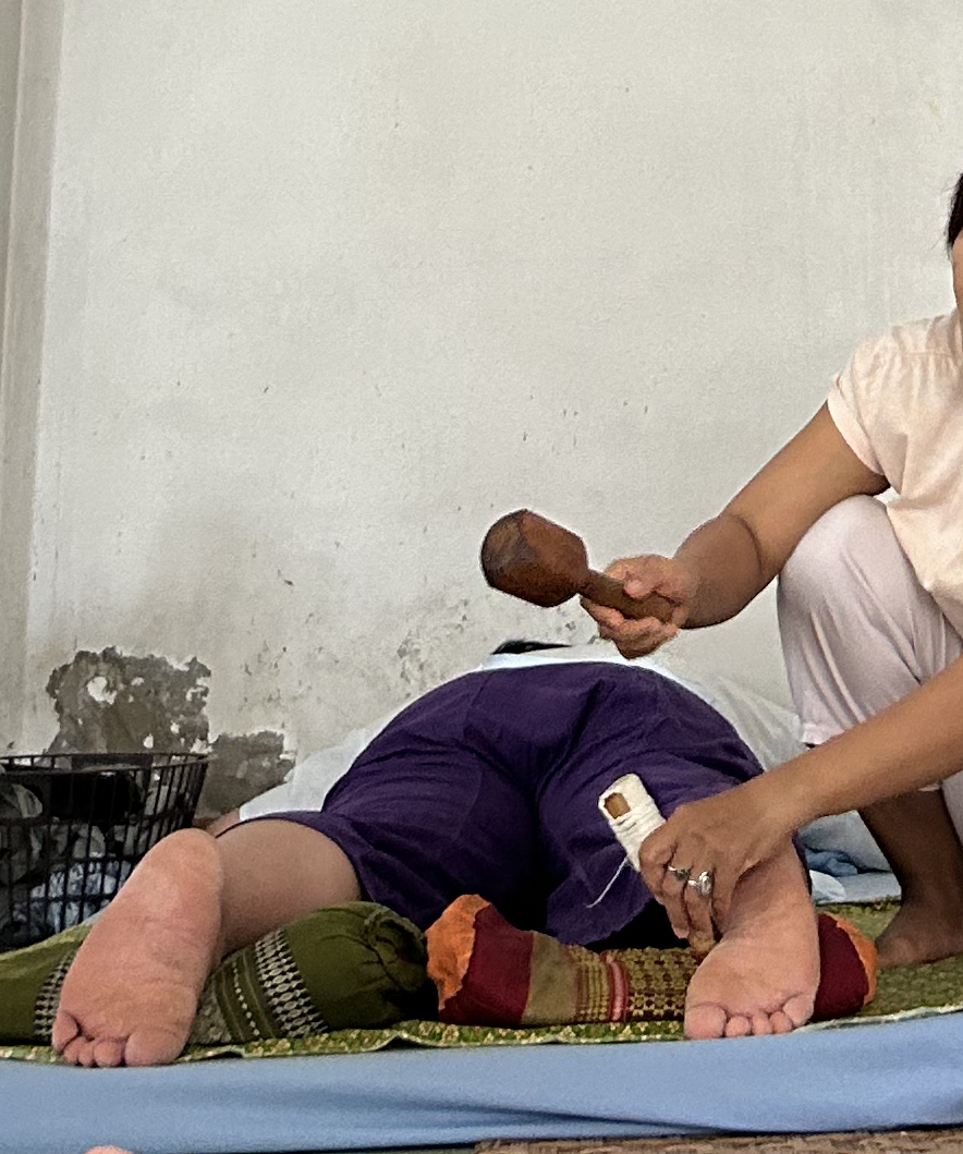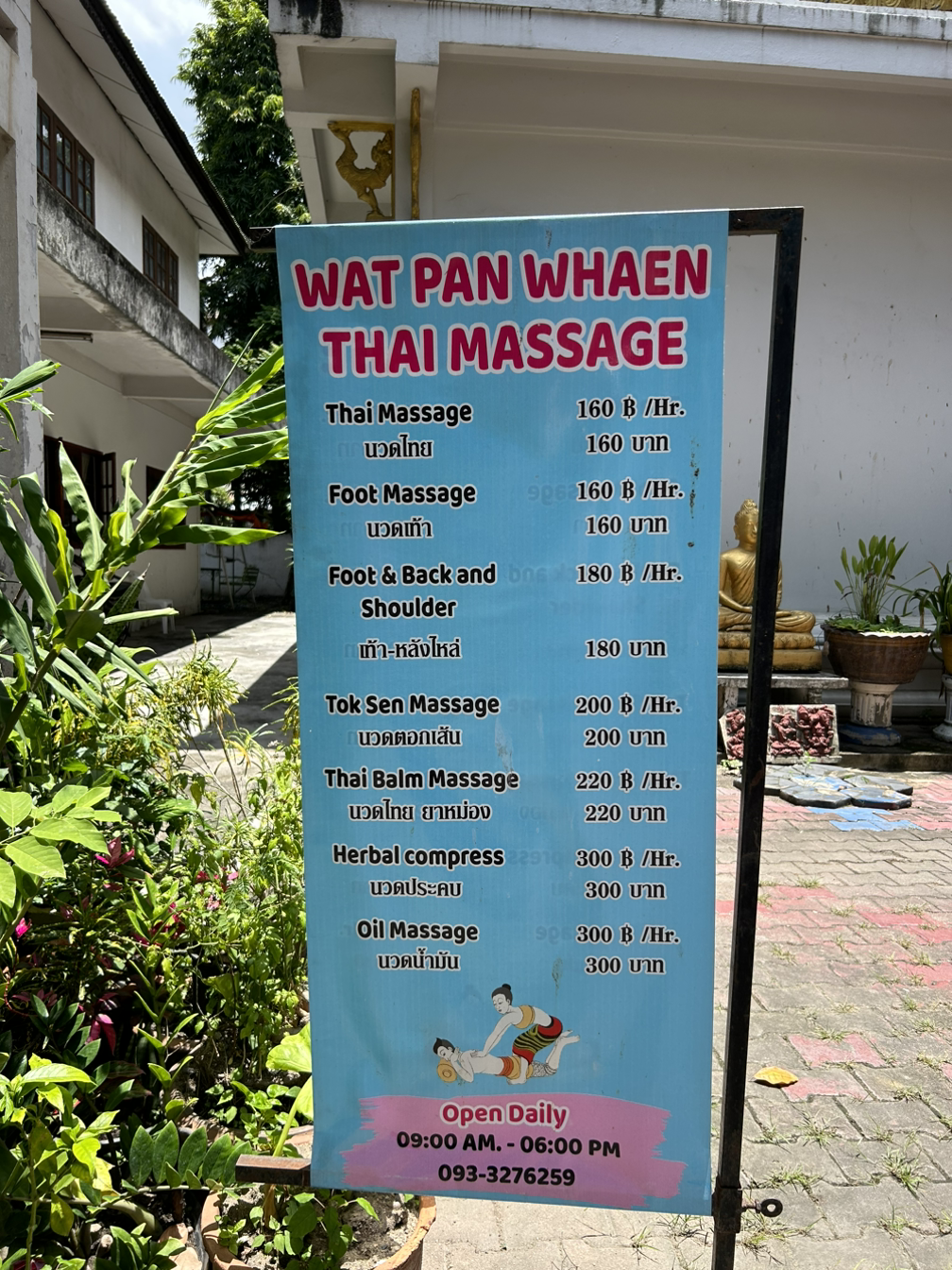 가성비 좋은 타이 마사지/툭쎈 마사지 샵. 사원 안에 자리 잡은 마사지 샵이라 그런지 가격이 정말 착하다. 대신 시설은 기대하지 말 것! 나는 다행히 대기 없이 받았지만 내 뒤로는 사람이 많아 대기줄이 꽤 길었다. 태국 마지막 날이라 궁금했던 툭쎈 마사지를 받았다.(나무못과 망치로 마사지하는 것) 뼈 마디 하나하나를 못을 대고 망치로 두드리는데 소리에 비해 아프진 않다. 나는 막 시원하거나 만족스럽지는 않았다. 궁금하면 짧게만 경험해 보시길ㅎㅎ 마사지는 역시 손이 최고!