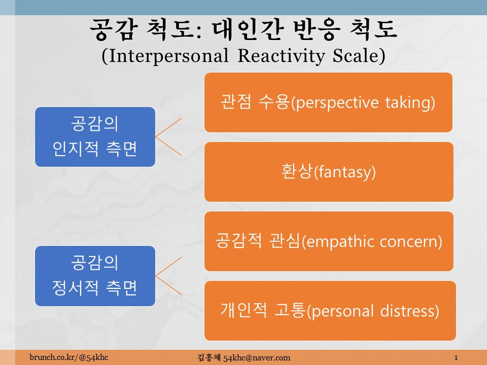 데이비스(1983)는 공감의 인지적 측면을 관점 수용(perspective taking)과 환상(fantasy)으로 정서적 측면을 공감적 관심(empathic concern)과 개인적 고통(personal distress)으로 구성된 공감 척도인 대인 간 반응 척도(Interpersonal Reactivity Scale)를 개발하였습니다(아래 표 참조).