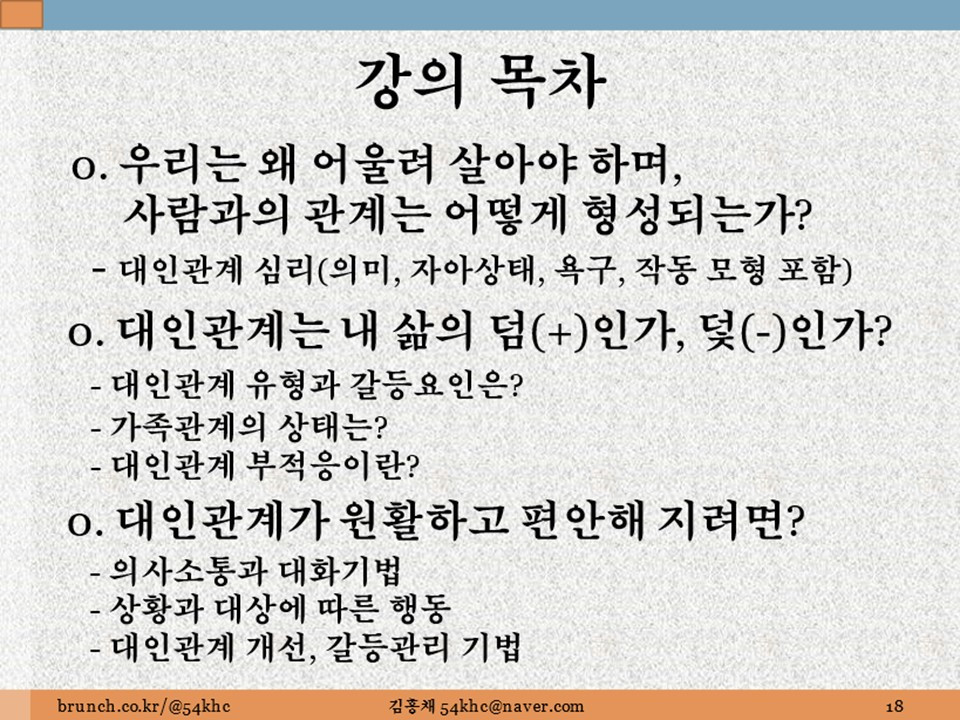 내용은 브런치 작가로서 [심리탐험가 김홍채의 브런치(brunch.co.kr/@54khc)]에 게재해 왔던 글과 대학원 학위과정과 재능기부 강의를 위해 준비하고 또 평소 심리학에 관한 지적 호기심을 채우기 위해 정리한 글 중에서 대인관계에 관한 것들을 일부 엮은 것입니다.
