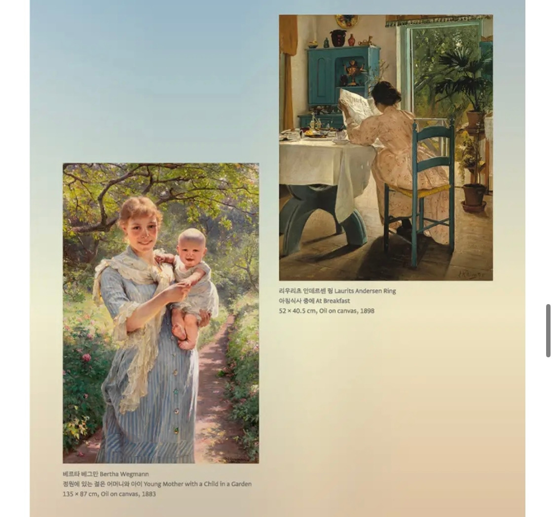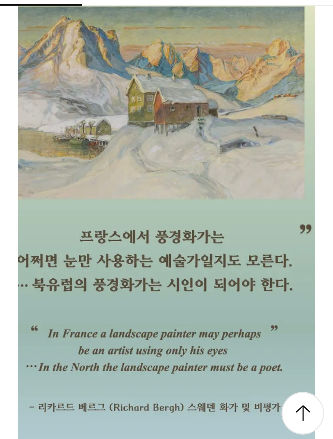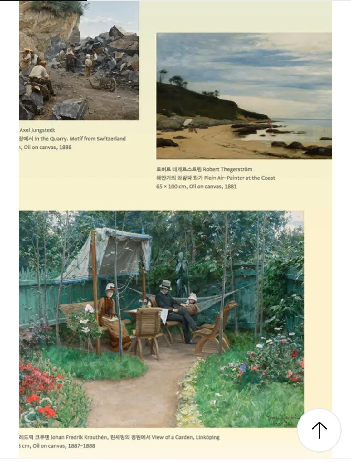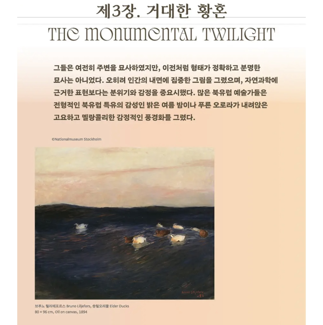 4월 18일 오전 11시 도슨트의 설명을 1시간 넘게 듣고 혼자 다시 작품을 감상했다. 원화 전시를 놓칠 수 없어서 인터넷 티켓 오픈일에 얼리버드 티켓을 예매했다. 그림에 문외한인 내가 보아도 아름답고 기품 있는 작품들이었다. 북유럽의 아름다운 풍경에 흠뻑 빠질 수 있었던 시간이었다. 화가들의 섬세하고 매혹적인 작품을 혼자 보기에는 너무 아까워 마이아트 뮤지엄의 상품 설명을 그대로 가져왔다.