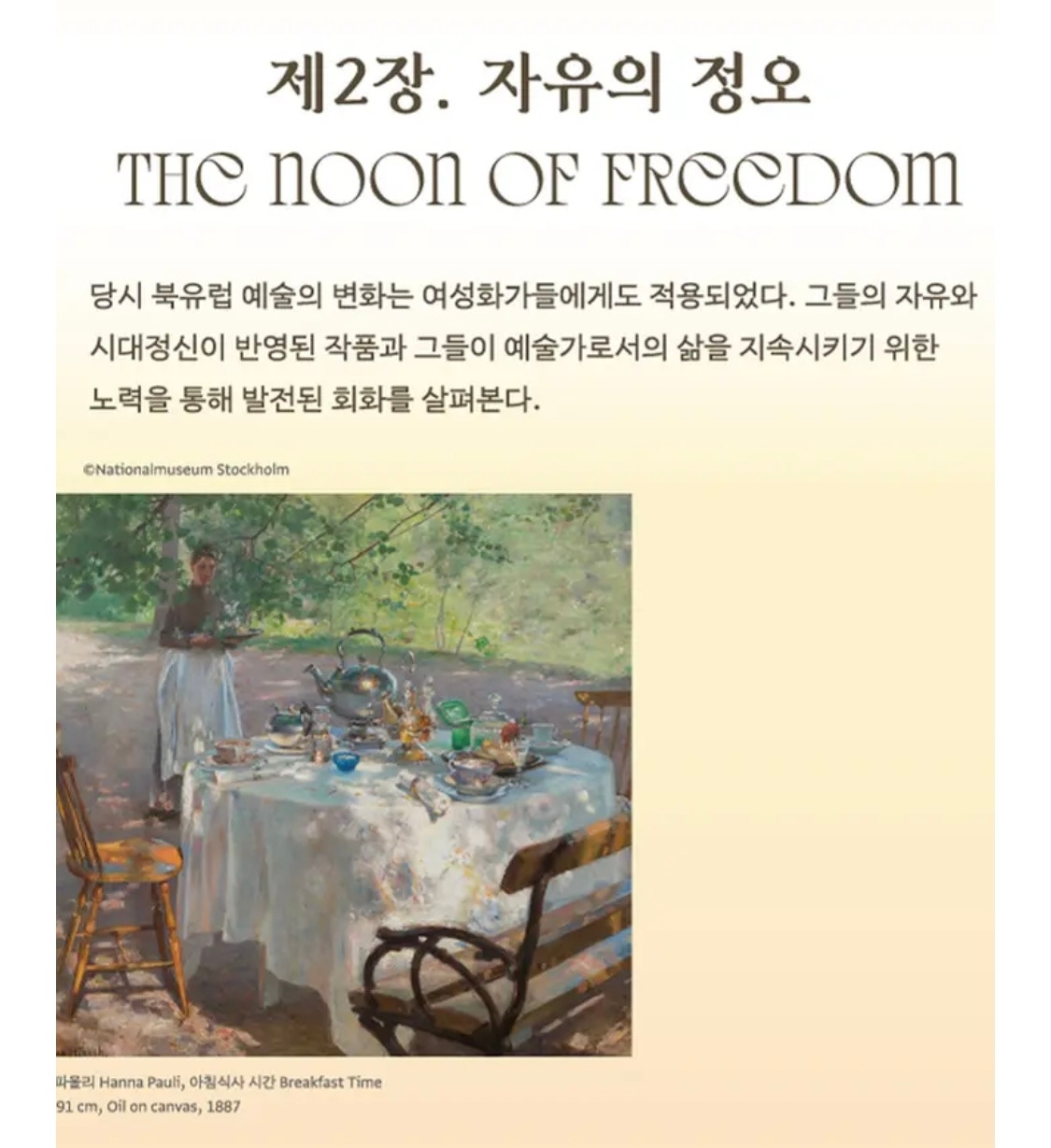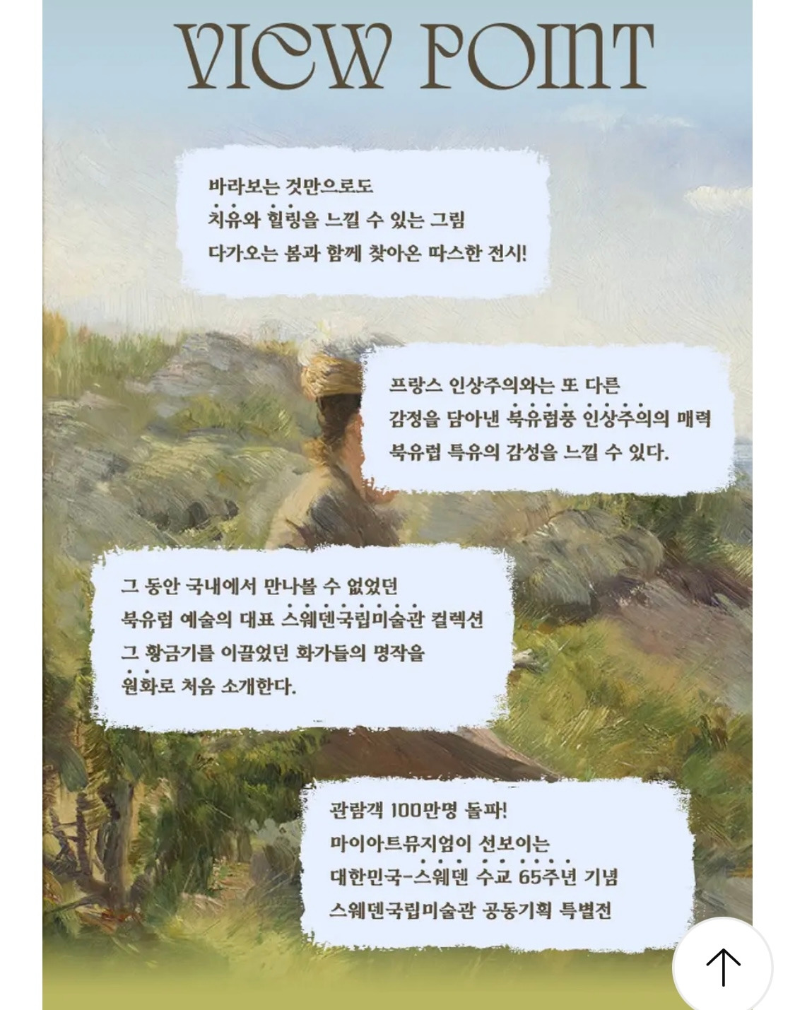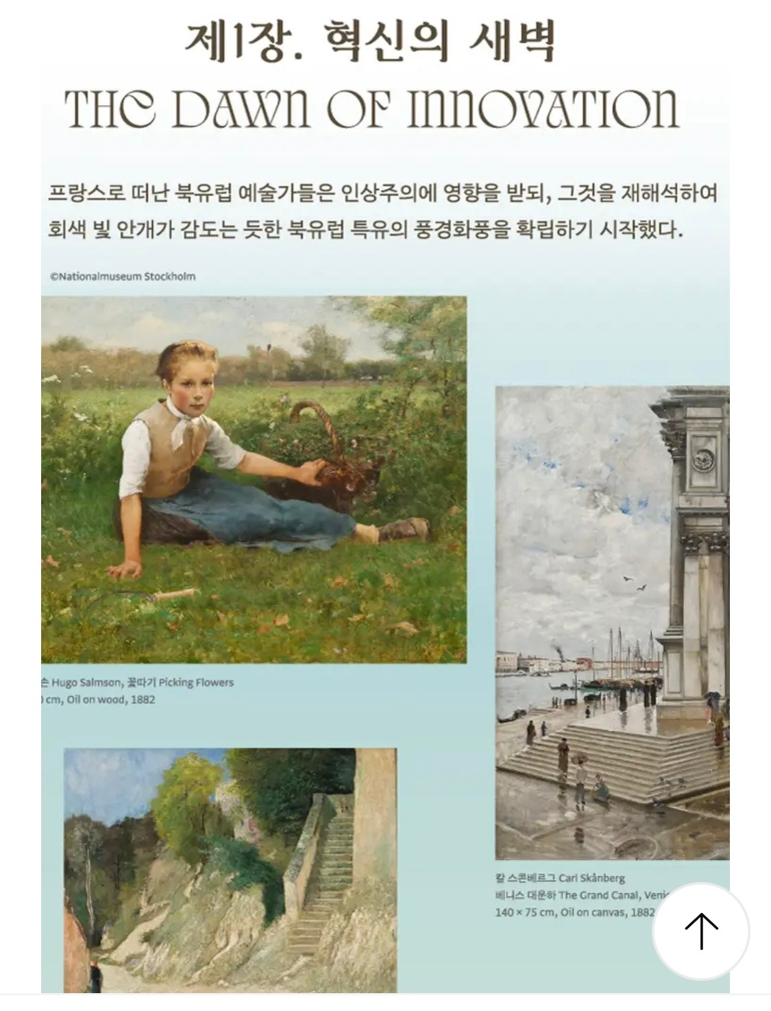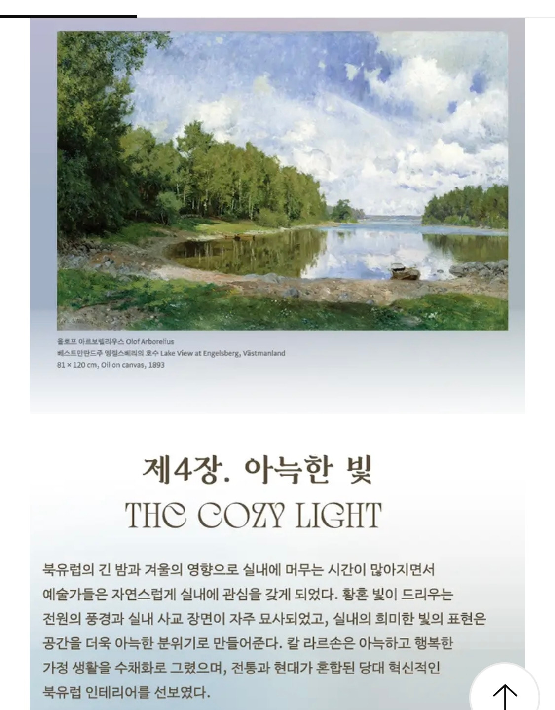 4월 18일 오전 11시 도슨트의 설명을 1시간 넘게 듣고 혼자 다시 작품을 감상했다. 원화 전시를 놓칠 수 없어서 인터넷 티켓 오픈일에 얼리버드 티켓을 예매했다. 그림에 문외한인 내가 보아도 아름답고 기품 있는 작품들이었다. 북유럽의 아름다운 풍경에 흠뻑 빠질 수 있었던 시간이었다. 화가들의 섬세하고 매혹적인 작품을 혼자 보기에는 너무 아까워 마이아트 뮤지엄의 상품 설명을 그대로 가져왔다.