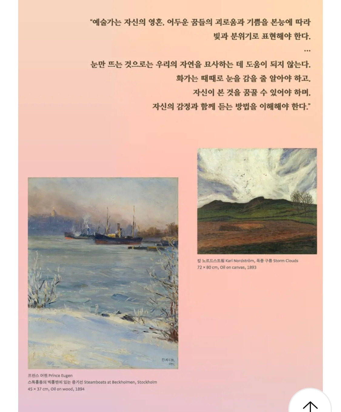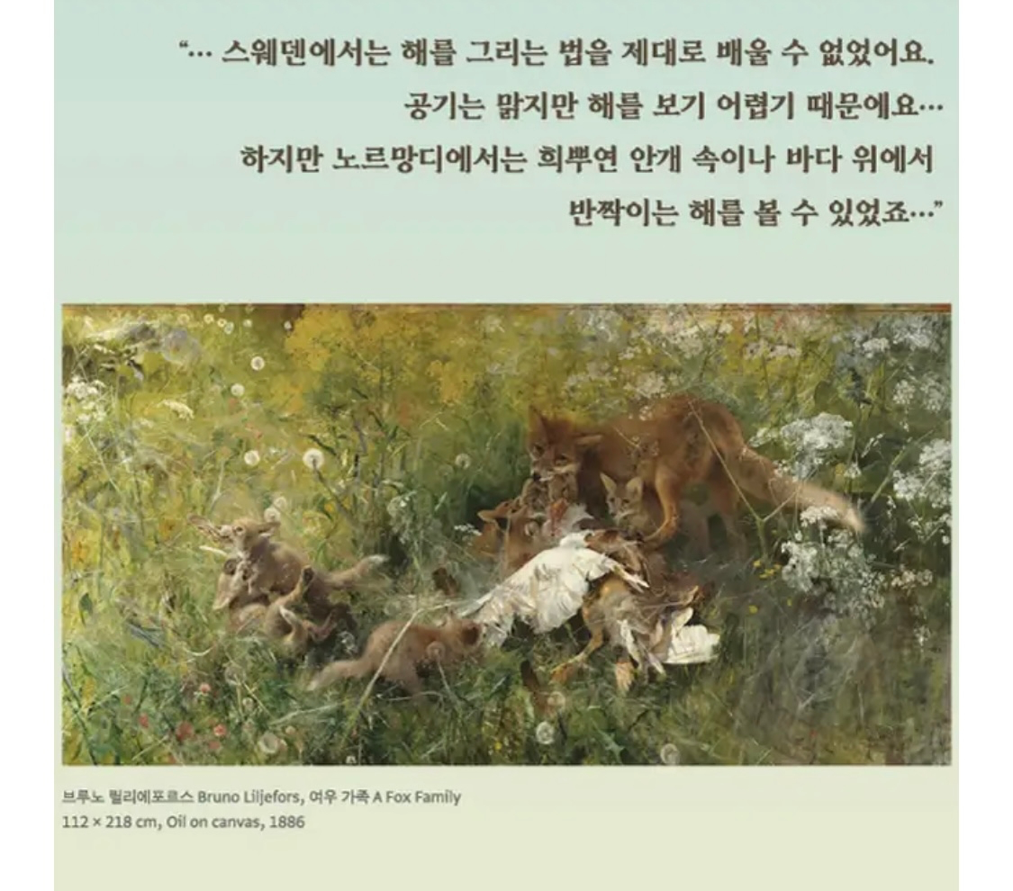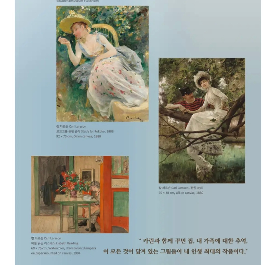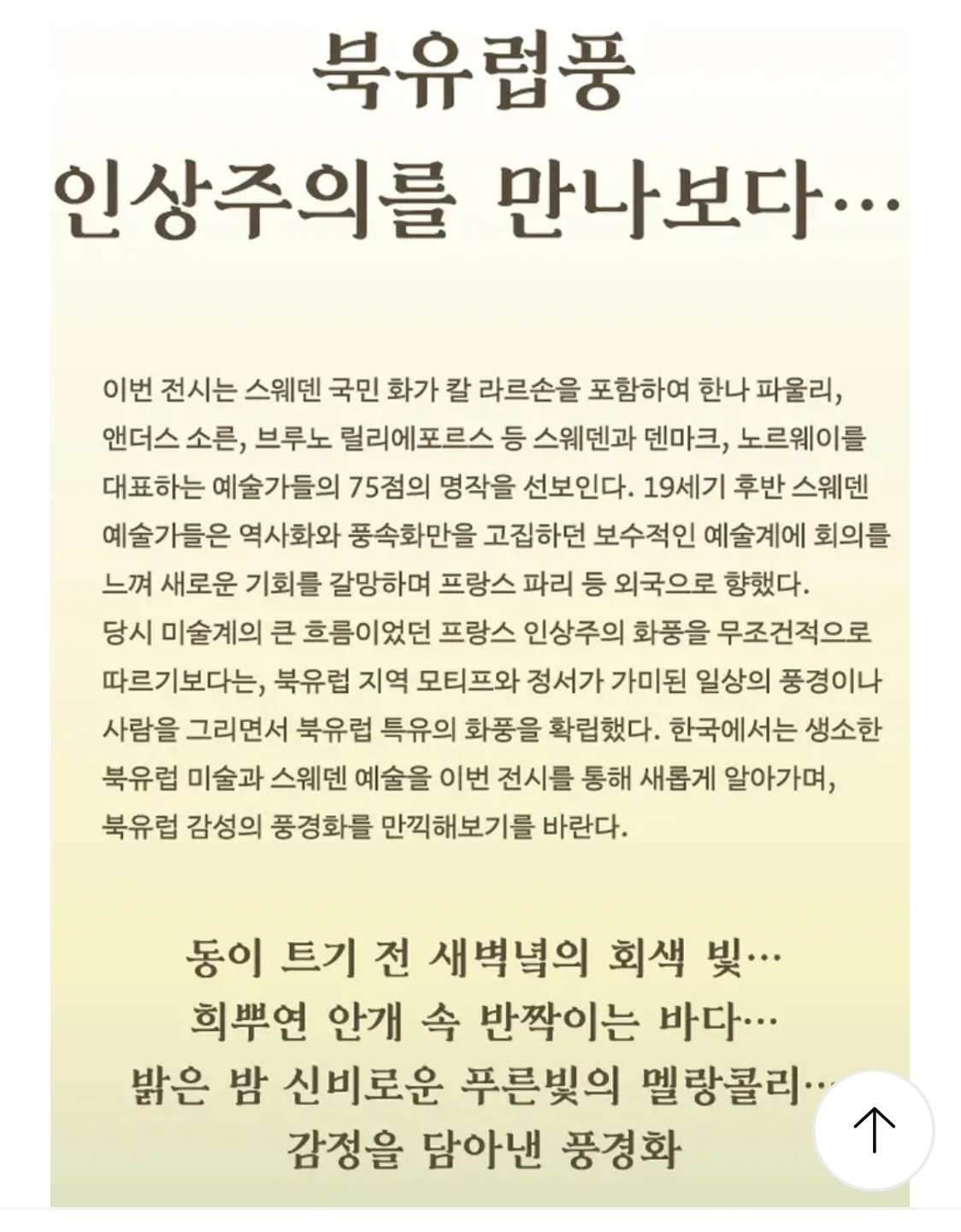 4월 18일 오전 11시 도슨트의 설명을 1시간 넘게 듣고 혼자 다시 작품을 감상했다. 원화 전시를 놓칠 수 없어서 인터넷 티켓 오픈일에 얼리버드 티켓을 예매했다. 그림에 문외한인 내가 보아도 아름답고 기품 있는 작품들이었다. 북유럽의 아름다운 풍경에 흠뻑 빠질 수 있었던 시간이었다. 화가들의 섬세하고 매혹적인 작품을 혼자 보기에는 너무 아까워 마이아트 뮤지엄의 상품 설명을 그대로 가져왔다.