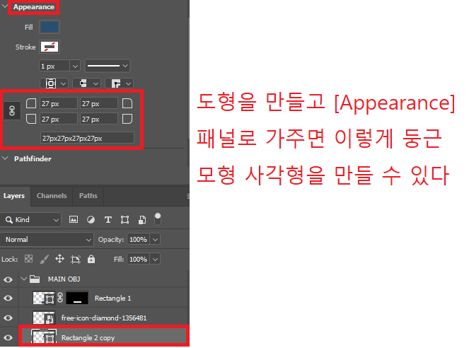 포토샵에서 만든 사각형 모서리를 둥그렇게 만들기 위해서 필요한 패널은 [Appearance] 패널이다. 여기서 둥근 모서리 사각형을 만들 수 있다.