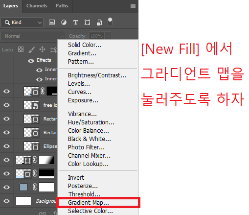 -전체적인 색감 보정을 들어가보도록 하겠다. 전체적인 색감을 조절하기 위해 [New Fill] > [Gradient Map] 클릭. Gradient Map은 아트보드 맨 위로 올려주도록 하자.