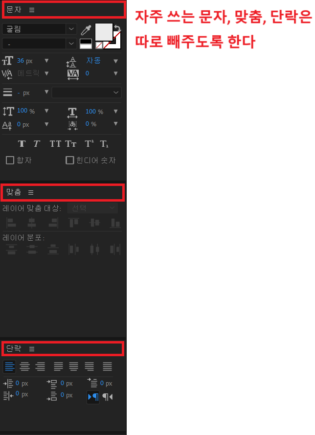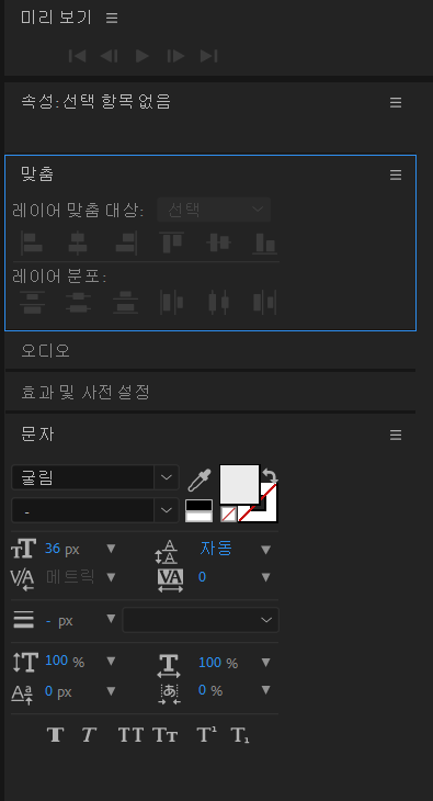 일단 창들을 조금 조절해보자면 아래와 같이 조절해보았다. 가장 많이 사용할 문자(Character), 맞춤(Align), 단락(Paragraph) 순서로 배열해주었다. 그 옆에는 Effect&Presets를 보여주면 된다.