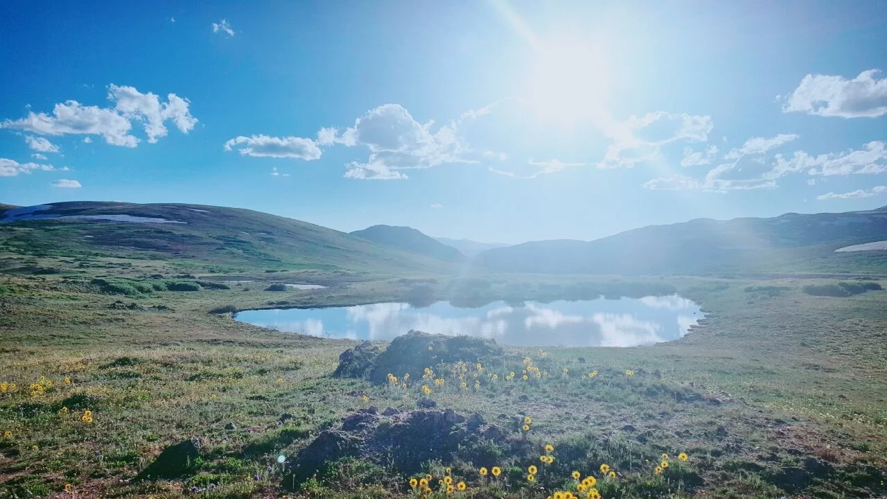 온도를 확인하고 옷을 챙겨 입은 후 내려서 작은 산책로 입구로 들어갈 때 까지는 전혀 기대가 없었다. 표지판에 써 있는 해발 12000피트가 넘는다는 숫자가 그저 신기했고, 진정한 콜로라도 주의 산길을 경험한다는 생각에 들뜨기도 했다. 그 곳은 참 독특한 곳이였다. 넓게 트여 있는 초록의 풍경으로 내 시야를 방해하는 것은 어떤 것도 없었다. 당연하지. 고산지대에는 나무가 자랄 수 없다. 보이는 산들도 늘 보던 크고 표족한 높은 산이 아니라 둥글둥글 귀엽다. 그리고 얼룩덜룩 하얀 눈이 작은 구릉 위에 쌓여있다. 그런데 역시나 그곳도 여름이라 작은 들꽃이 아기자기하게 하나 가득 초록 벌판에 옹기종이 피어 있다. 그리고 드문드문 하지만 곳곳에, 아마도 눈이 녹아서 만들어진 작은 연못이겠지. Tarn 이라고 하는 예쁜 연못이 거울처럼 반짝이며 빛나고 있었다.