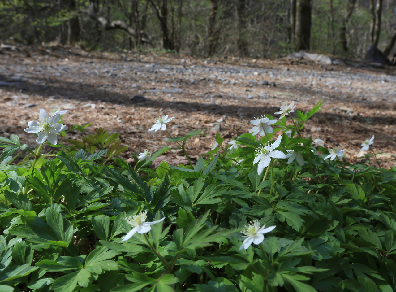 계곡 주변의 언덕배기는 산사람들이 살기 좋은 터였을 것이다. 밭을 만들기 위해 꼭 필요한 것과 사람의 삶을 이어가는 열쇠는 물이니까. 태백산은 계곡 주변이 꽃밭이다. 이 산꽃과 호랑이한테 잡아먹힌 사람의 돌무덤을 보면, 태백산의 계곡에 사람과 꽃이 어울려 살았을 것이다. 눈 녹아 계곡물이 시원하게 흐르는 4월 중순이 되면, 물가를 좋아하는 ‘들바람꽃’을 찾는다. 잎 같은 3개의 포가 돌려나서 무성한 잎처럼 보이는 이 꽃은, 아직 눈이 남아 있고 나무들도 잎을 틔우지 않아서, 이 포엽만 빽빽한 녹색을 자랑한다. 톱니 모양의 잎 같은 포엽 끝에 길게 꽃대를 밀어 올려, 하나의 꽃대에 한 송이씩 핀다. 꽃잎처럼 보이는 흰 꽃받침 5개가 수평으로 펼쳐 피고, 그 위에 많은 암술과 수술이 수평의 꽃받침과 달리 수직으로 튀어올라 있다. 긴 꽃대 때문에 바람이 조금만 불어도 사진 찍기가 어려워, 사진기는 넣어두고 흔들리는 들바람꽃을 감상한다.