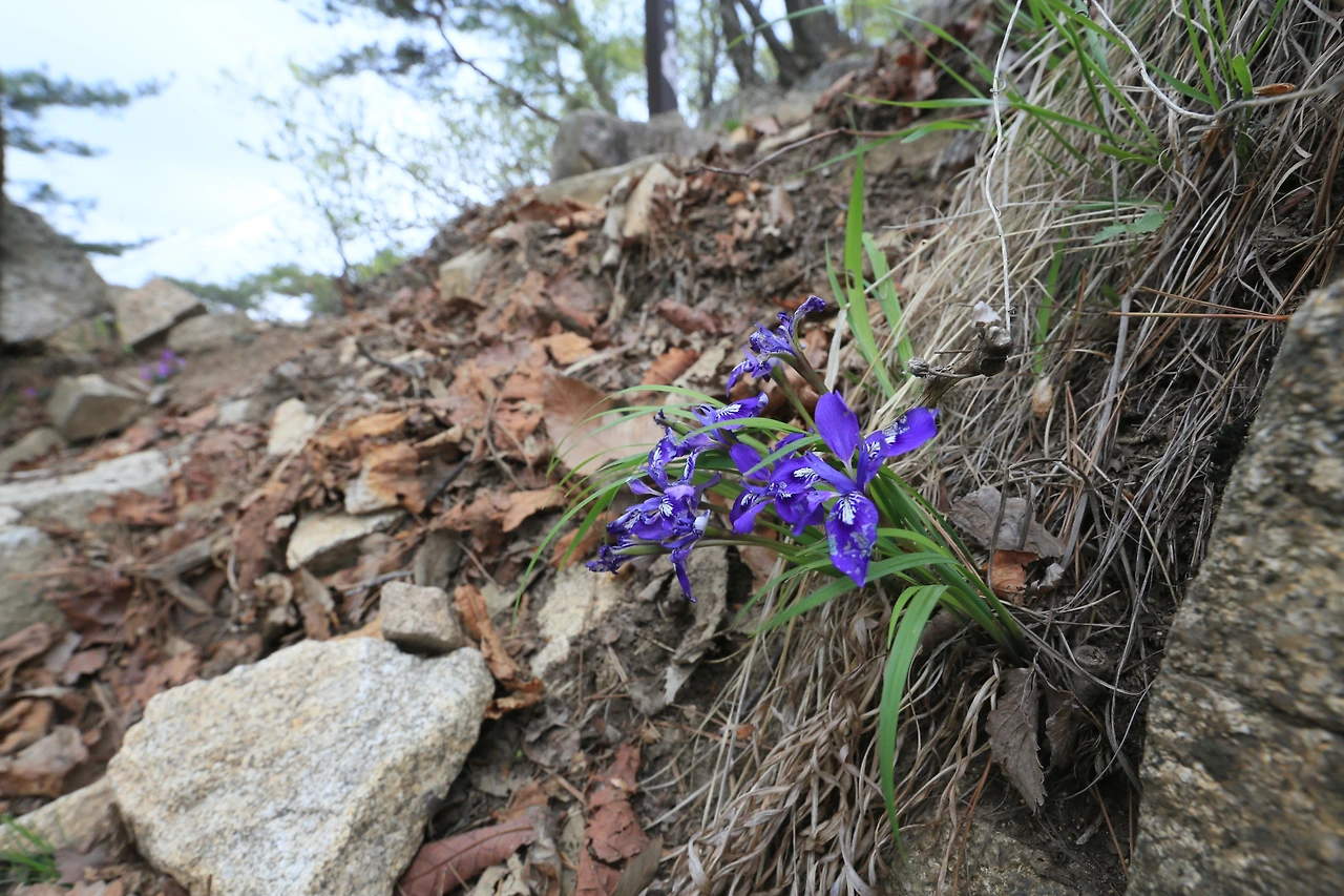 포천시 이동면에서 비선폭포, 등룡폭포를 거쳐 억새밭을 지나 능선에 올라서면, 철원군 신철원리로 들어선다. 억새밭에 들어서기까지 길동무가 되었던 각시붓꽃은 더 이상 보이지 않고, 억새밭에는 2026년까지 완공된다는 케이블카 설치를 알리는 푯말과 거대한 기중기가 산정호수 쪽으로 머리를 들고 있다. 애써 철원 쪽의 삼각봉으로 눈을 돌리면, 칼날능선에 핀 진달래꽃이 반긴다. 삼각봉을 지나 명성산 정상으로 가는 산길은 한적하여, 진달래꽃을 길동무 삼기에 충분하다. 오른쪽에는 산 중턱을 깎아 꼬불꼬불 닦아 미로 같은 군훈련장 능선 내내 보이고, 왼쪽에는 산정호수에서 울려 퍼지는 유행가 노랫가락이 듣지 않으려 해도 들린다. 이젠 명성산도 다 왔나 하는 생각에 철원의 산길 안내판을 본다. 같은 저수지이지만 조용한 모습의 용화저수지와 1975년 8월에 일어난 일이지만 아직도 진실을 밝히지 못한 장준하선생의 추락 현장인 약사령의 시작점이 포함된 산길 안내도를 본다. 이곳을 또 온다면 철원방향으로 오리라 마음먹고 되돌아오며, 다시 각시붓꽃에 집중한다.