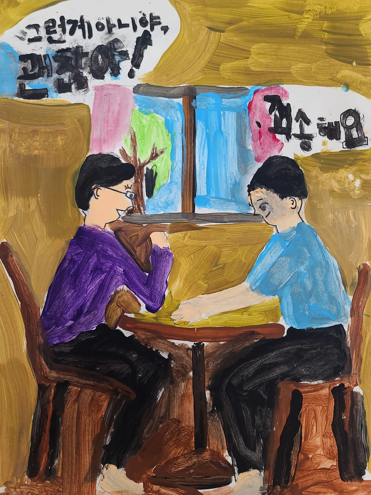 그런데 학교에서도 같은 상황이 많다. 특히 툭하면 친구들에게도 ‘미안하다’라고 한다. 예를 들면 지나가다 톡 치게 되면 ‘어 미안 미안.’이라고 먼저 말한다. 대부분의 친구들은 ‘어 그래’라고 대수롭지 않게 넘어가고 신경이 날카로운 친구는 ‘됐어!’ ‘신경 쓰지 마’ ‘왜 미안하다고 하는 거야’ 라며 나를 당황스럽게 하기도 한다. 그래도 나에게 잘못을 덮어 씌우거나 이런 건 아직 없다.