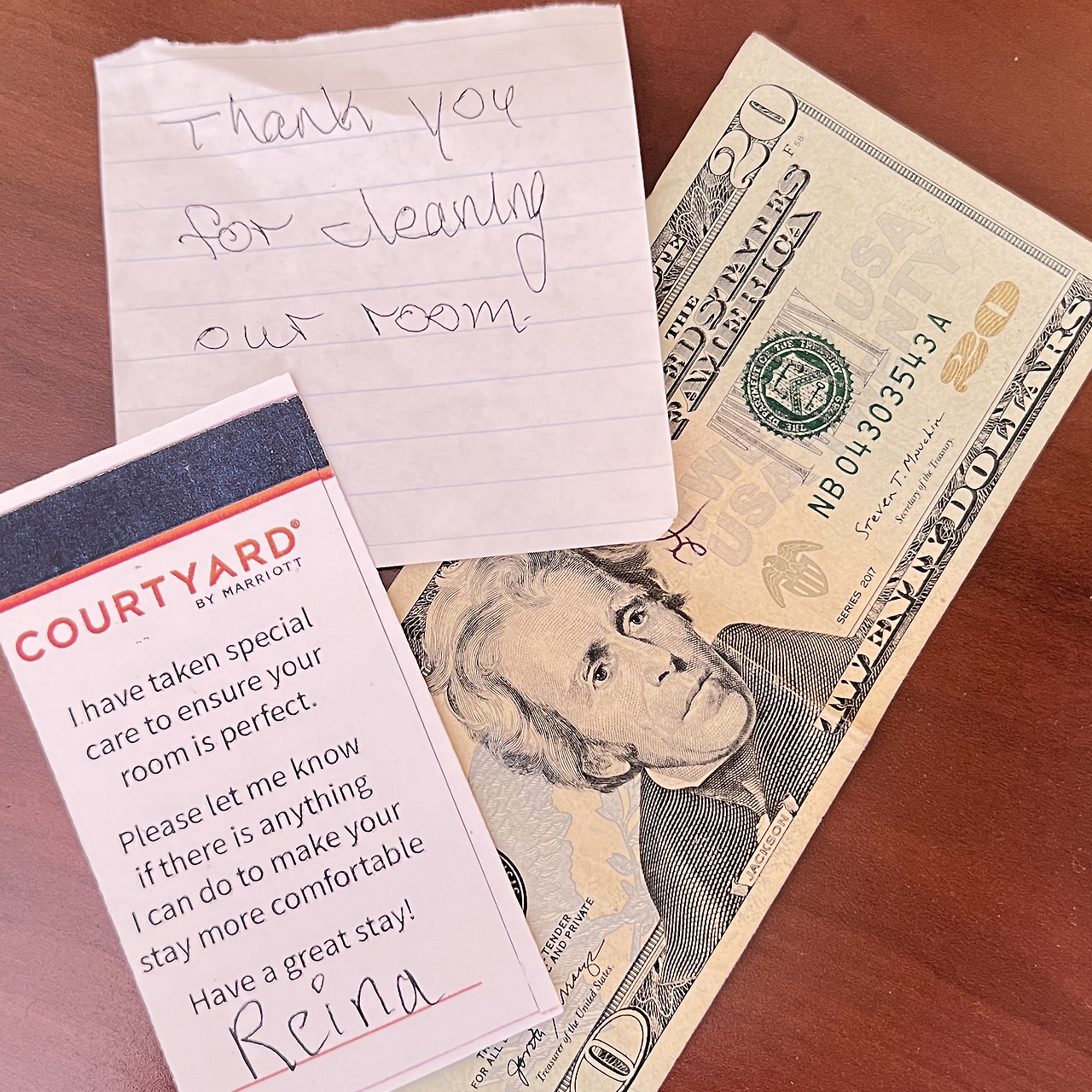 언어로 직접 “잘했다” “열심히 했다” 칭찬을 받을 때도 기분 좋게 성취감을 느끼지만, 객실을 떠나면서 하우스키퍼에게 남기는 메모 한 장과 팁은 확실한 위로와 보상이 된다.