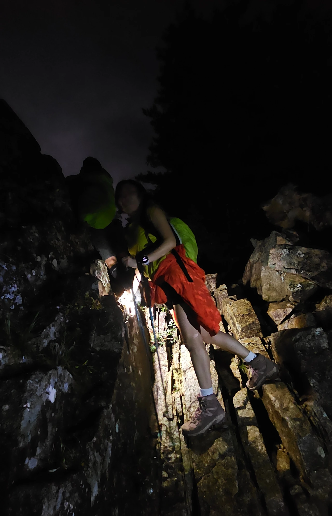 랜턴을 착용하고 우리는 밤길을 걷기 시작했다. 오르막길 본격 진입로부터는 사람들이 몰려 차례를 지키며 천천히 걸어야 했다. 기온은 낮았지만 몸에서 나는 열기와 땀으로 옷이 짧아도 처음에는 춥지 않았다. 그런데 괜히 아침에 머리를 감았더니 축축한 머리카락과 함께 멈춰서 쉬는 구간에서 한기가 느껴졌다. 나는 잠바를 입고 우비를 걸치며 몸에 보온을 신경 쓰기 시작했다. 차츰 주위는 밝아지고 '소공원 주차장'에서 출발한 우리는 어느새 '비선대'를 지나 '마등령 삼거리'에 도착해 있었다.