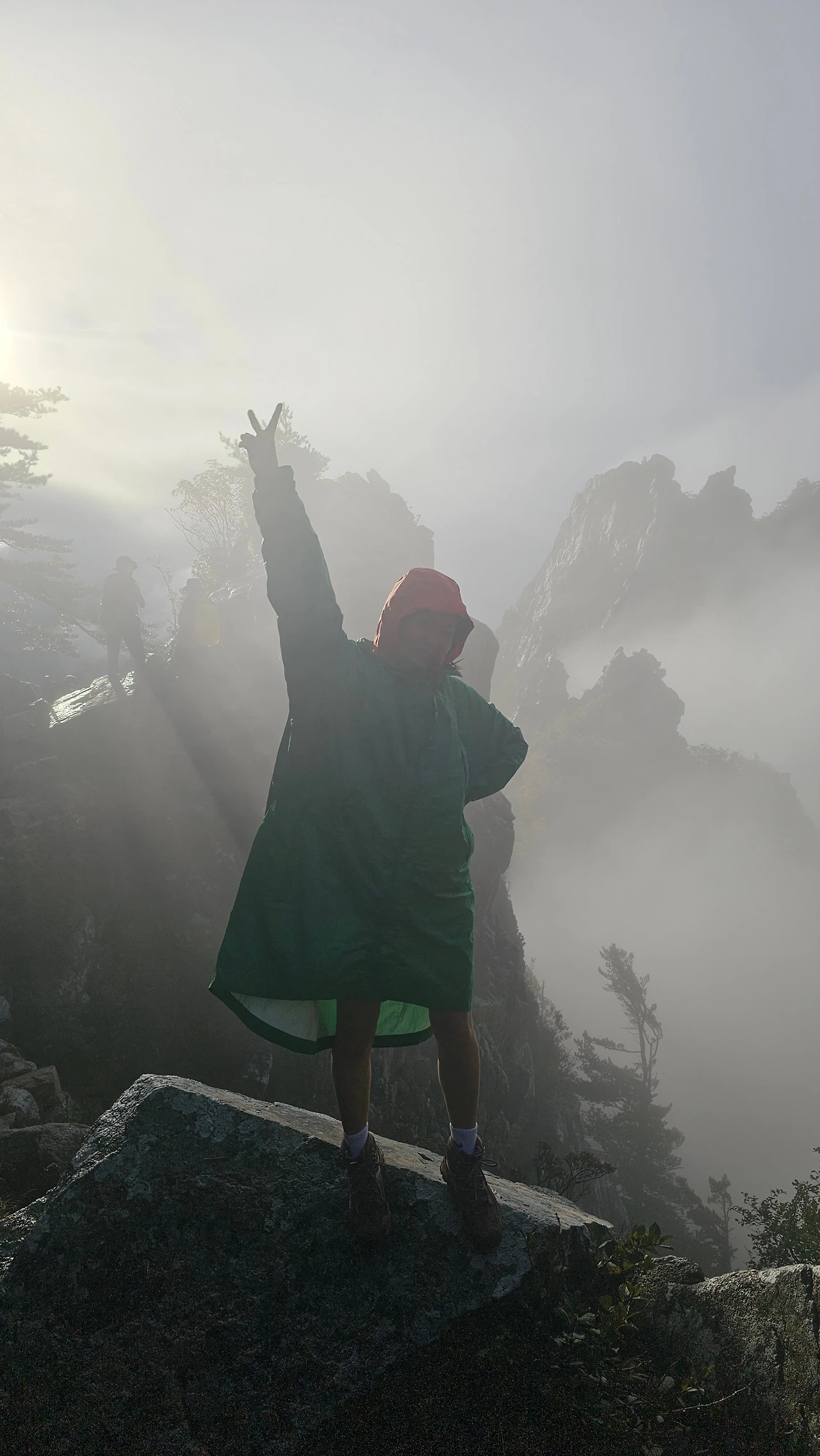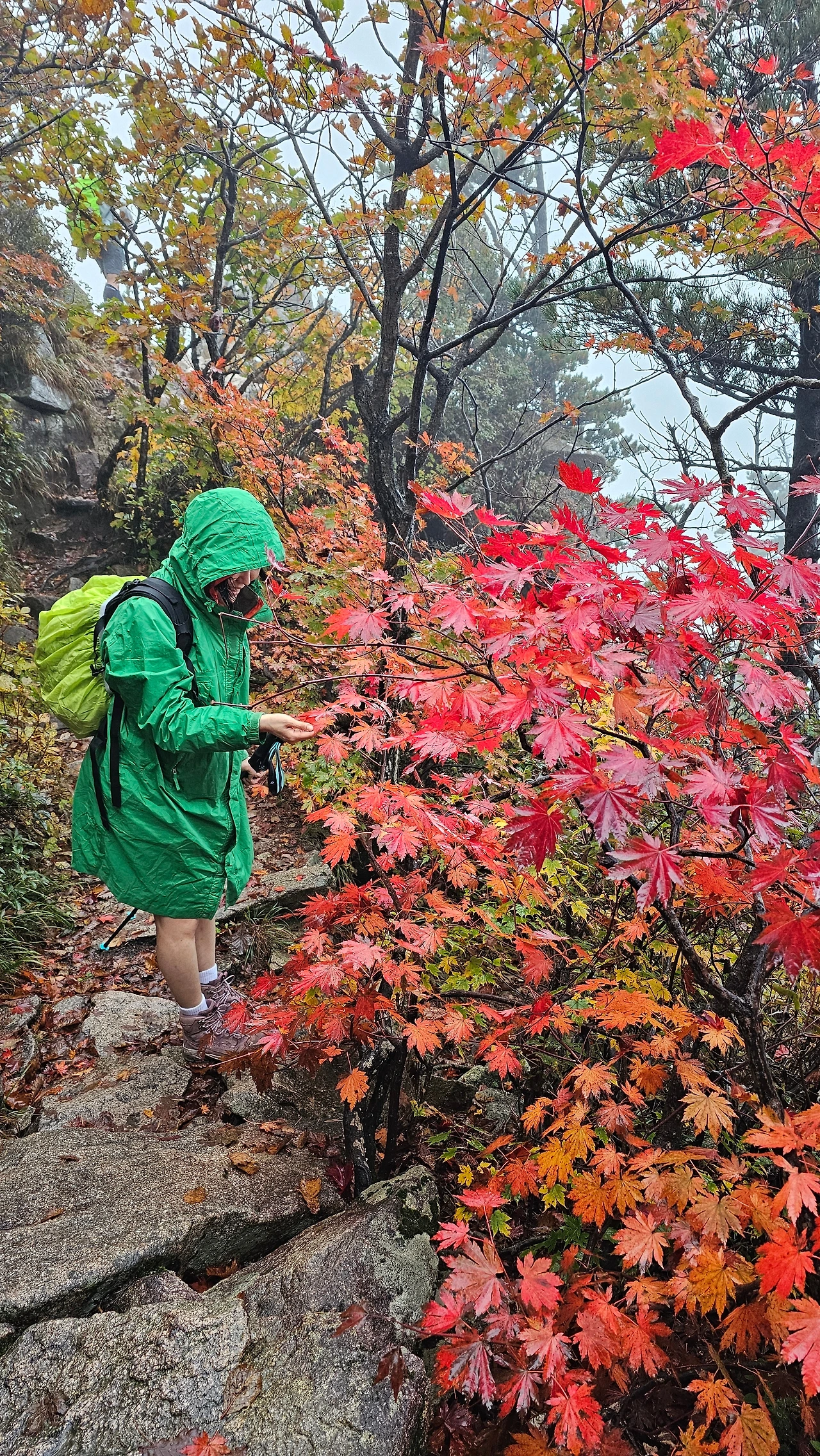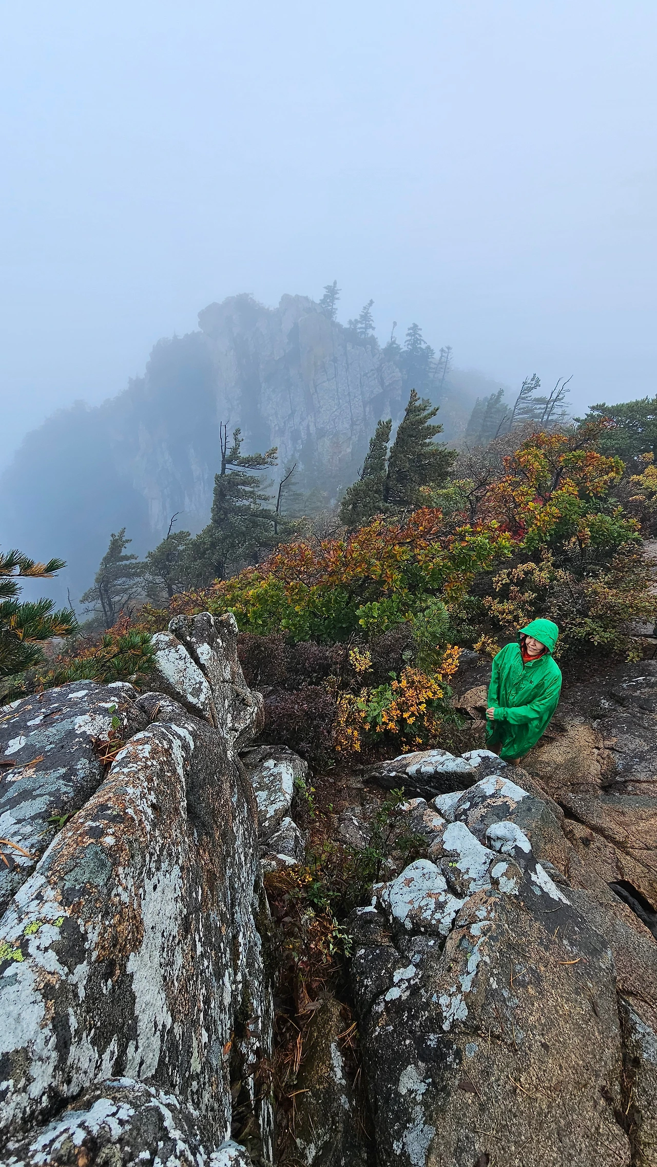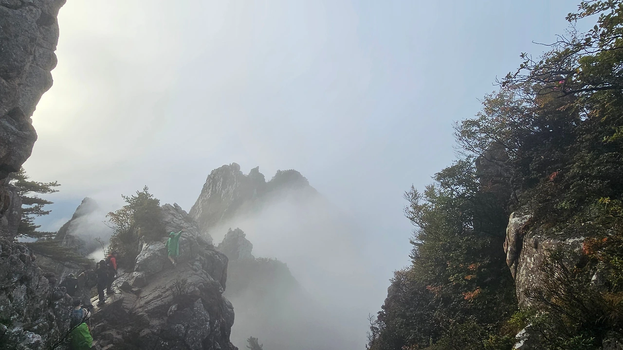 해가 떴지만 마등령 삼거리부터는 곰탕이었다. 설악산의 비경은 구경할 수가 없었다. 아쉬운 데로 가까운 단풍과 바위를 구경하며 한걸음 한걸음 앞으로 걸어갔다.