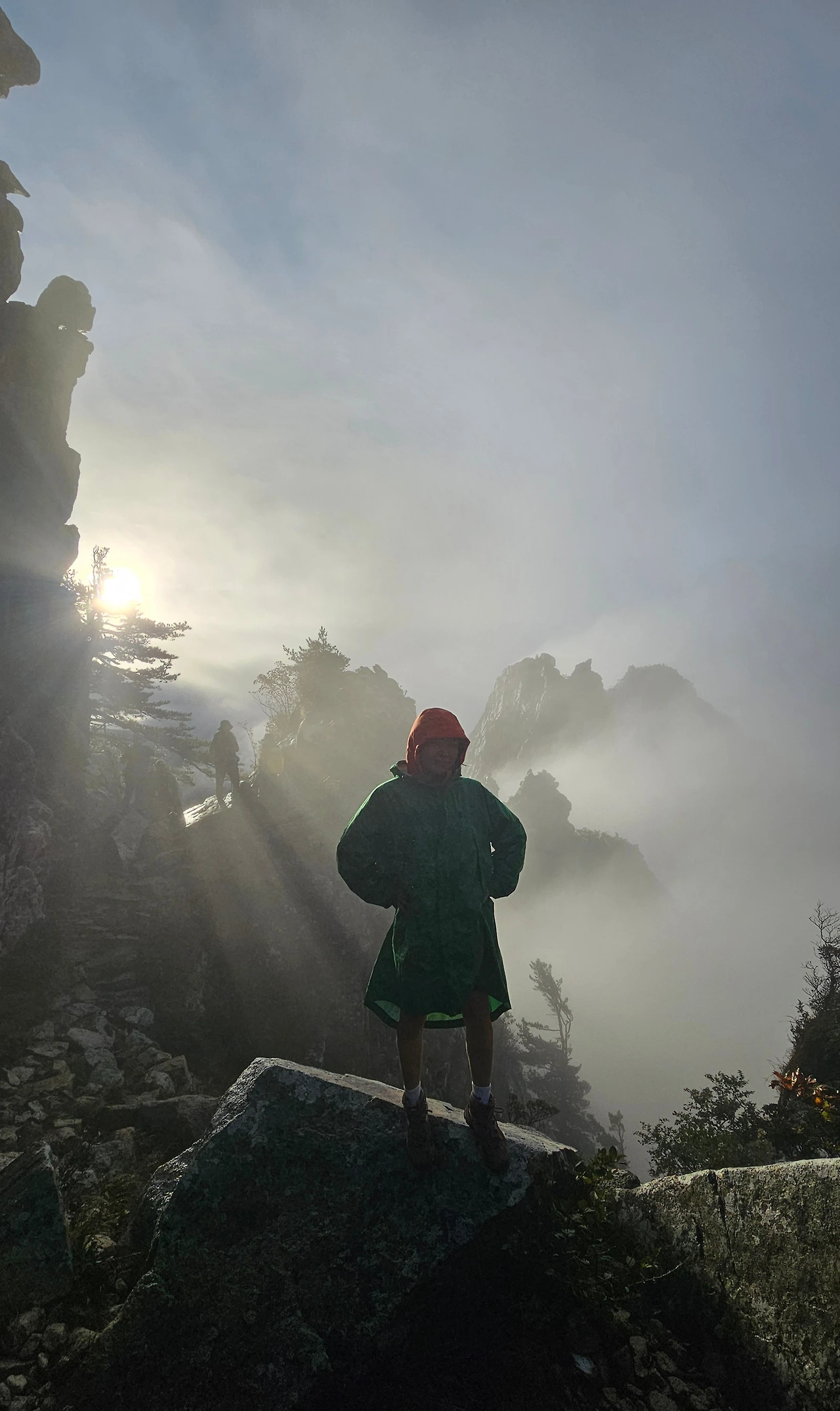 새벽이지만 주차장은 서둘러 출발하려는 사람들로 붐비기 시작했다. 우리는 새벽 2시 40분쯤 등반을 시작했다. 비는 거의 느끼지 못할 만큼 부슬부슬 아주 약하게 내렸다. 처음에는 우비를 쓸 필요도 없었다. '곰탕'이란 용어처럼 안개가 자욱했지만 멋진 풍경을 설악이 허락해 주기만을 바랄 수밖에 없었다.