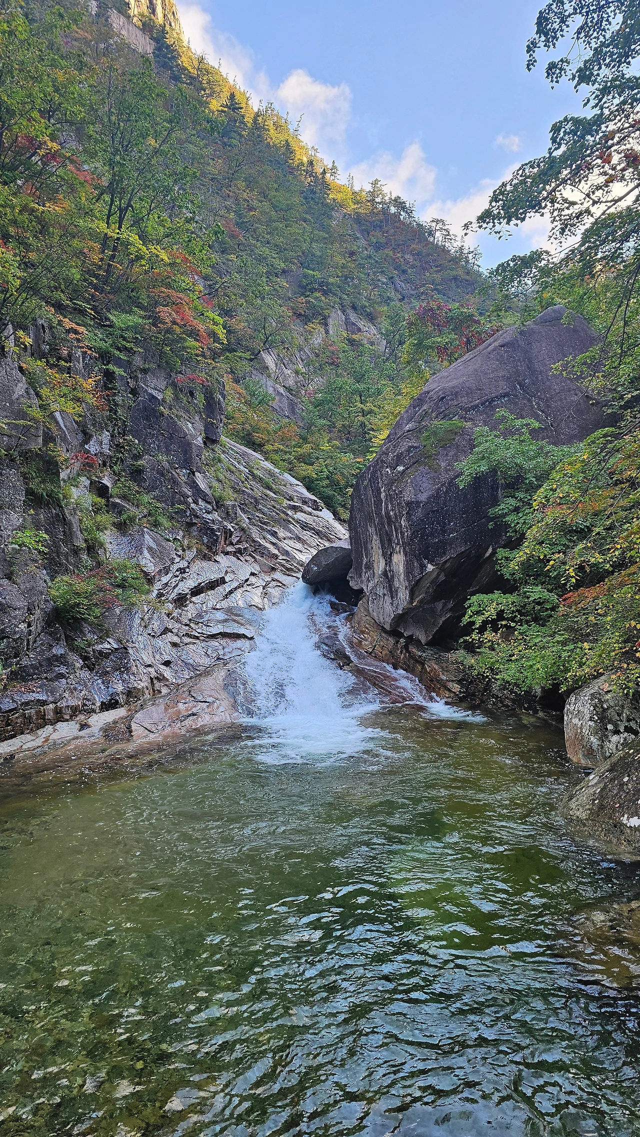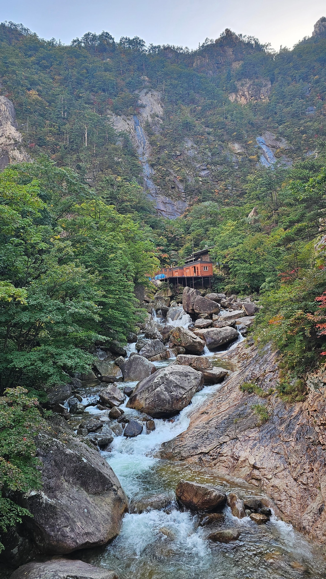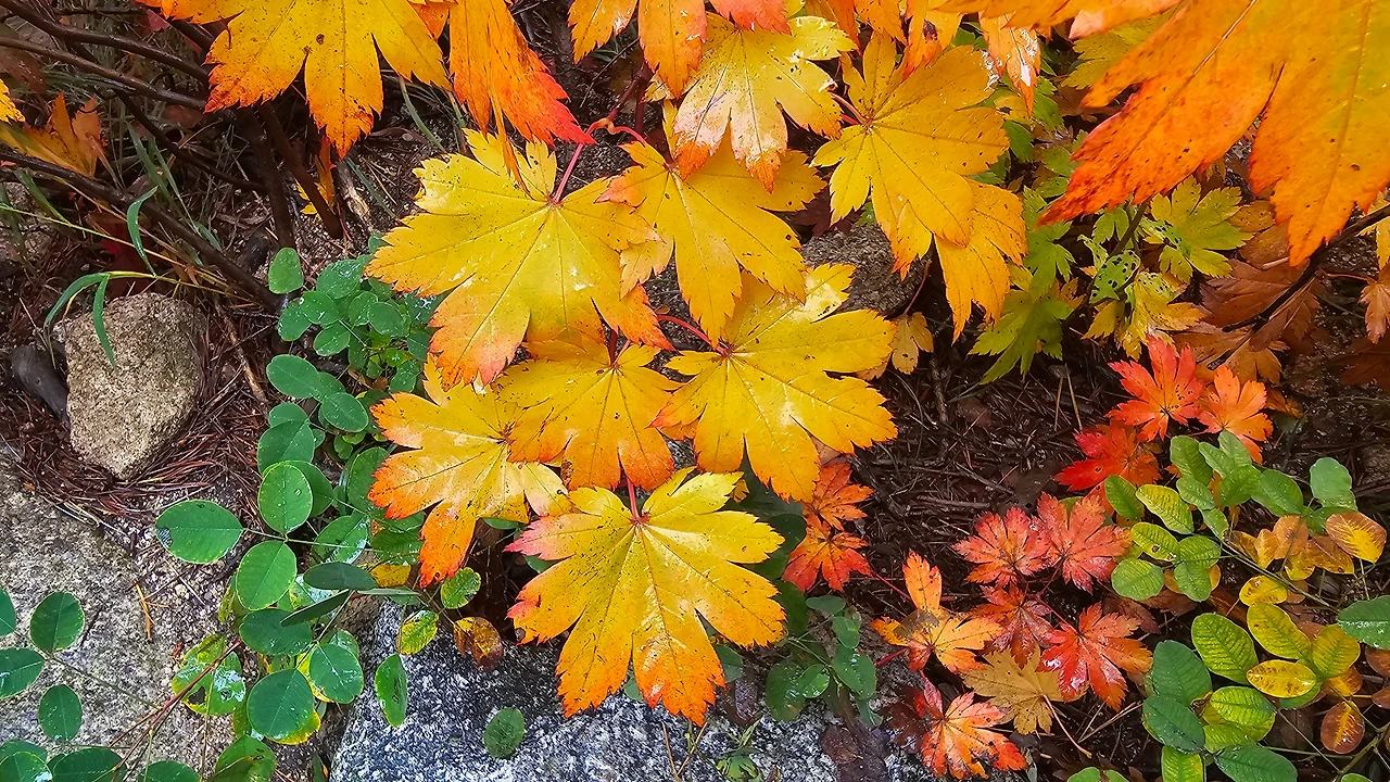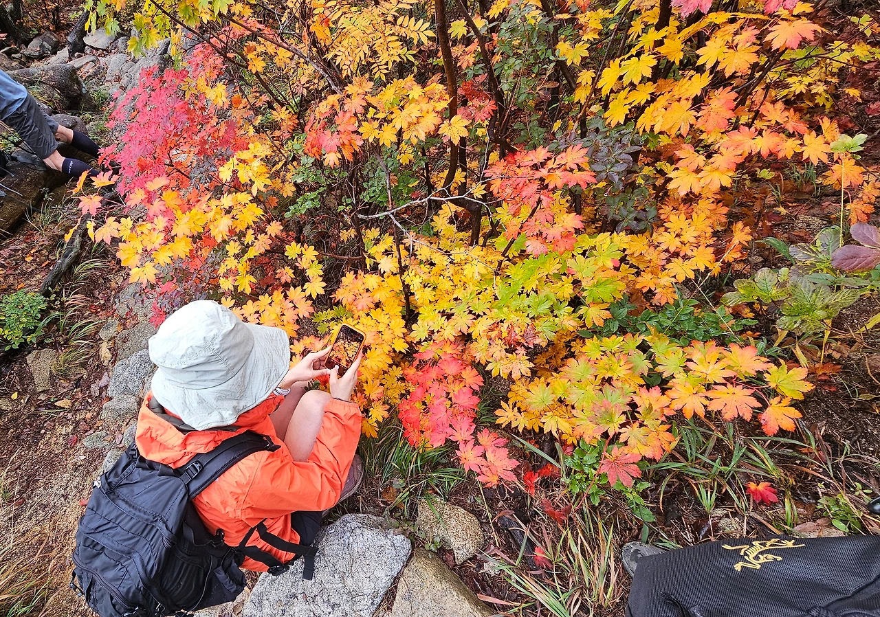 오색단풍이 가는 길목마다 반겨주니 기분이 좋았다. 비는 그쳤다. 이렇게 고운 선물을 한 아름 안겨주기 위해 어제 그렇게 비를 내렸던 것일까? 시야는 깨끗해져 있었다. 빗물을 머금은 잎들을 보니 신선한 기운이 더 새록느껴지는 것 같았다.