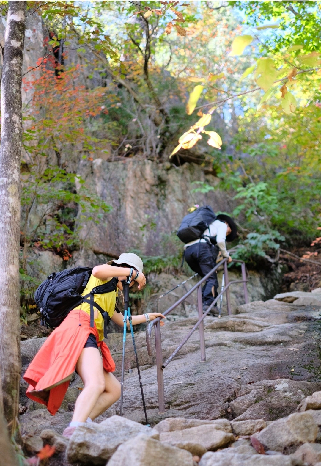 안전대를 잡고, 계단을 오르내리고, 바위를 타고...