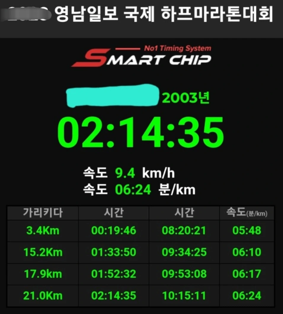 레이스가 끝나고 난 뒤, 골반은 많이 뻐근하고 다리도 뻣뻣했습니다. 걸음조차 제대로 걷지 못해 절뚝절뚝거렸지만 마음은 승리자가 된 듯 도취되었습니다. 무엇보다 메달을 목에 걸고 기록을 폰으로 확인할 때는 이루 말할 수 없는 감격이 저의 마음을 압도하기 시작했습니다.