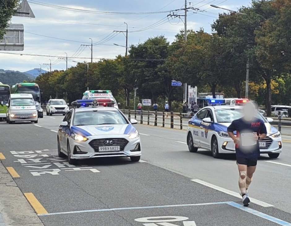 그렇게 한참을 선수들을 지켜보다가 저희는 마침내 풀코스의 마지막 주자를 보게 되었습니다. 어떻게 알게 되었냐고요? 경찰차 2대, 구급차 2대. 그리고 도로통제가 해제되기만을 애타게 기다리고 있던 차들과 버스들이 천천히 뒤에 따라붙고 있었기 때문입니다.