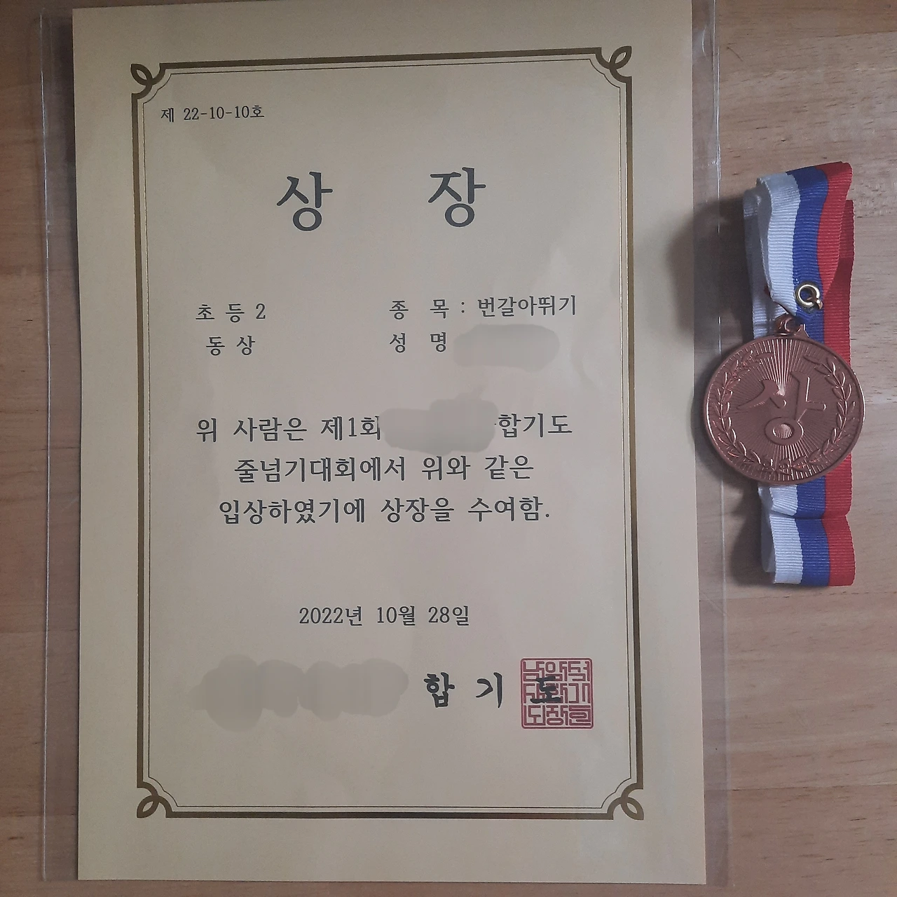 "저번에 줄넘기 대회했거든. 거기서 상 탄 거야."