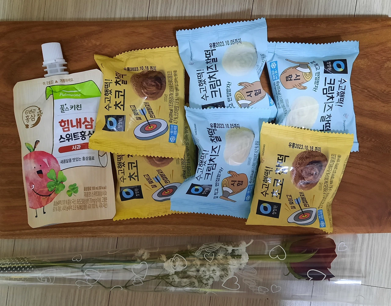 다만 작년엔 찹쌀떡과 장미 한 송이뿐이었는데, 올핸 안개꽃이 수줍게 동행했다.