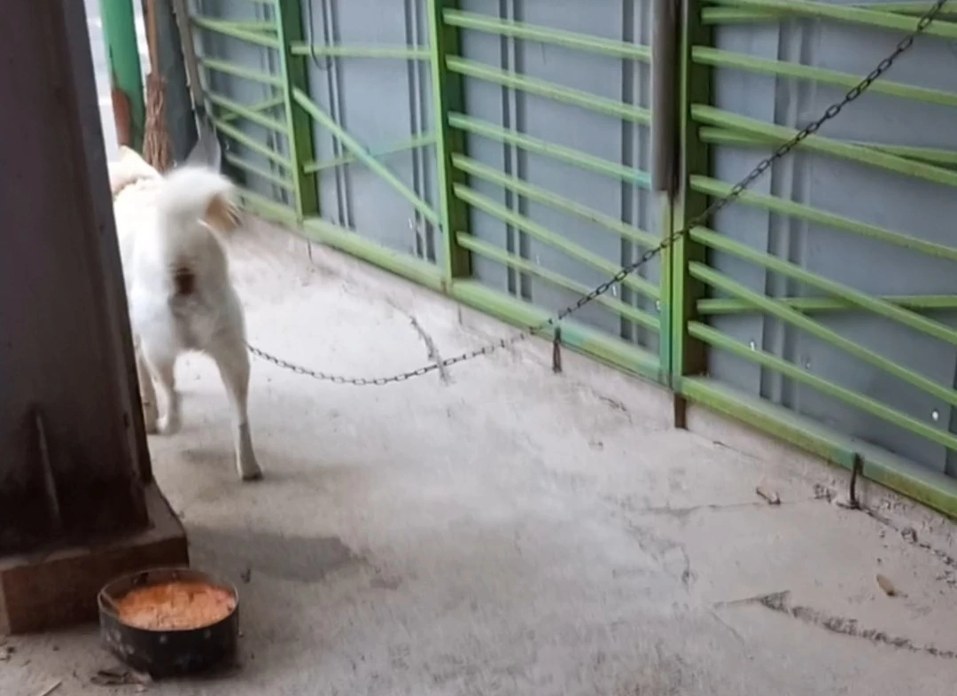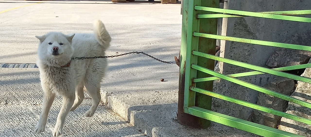 그 백구가 철문과 담벼락 사이의 한 뼘 공간을 자유자재로 드나들어서 깜짝 놀랐다. 그렇게 큰 덩치가 쏙 빠져나오는 게 신기한데 담장 안쪽에서 고정된 쇠줄 때문에 밖으로 나와도 문에 거의 바짝 붙어있게 된다.