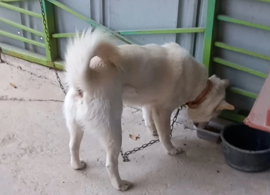 어느 주말, 남편과 외출했다가 집에 오는 길에 흰둥이에게 가보려고 조금 떨어진 곳의 공터에 차를 세웠다. 공터 바로 옆은 경사가 가파른, 시멘트로 포장된 진입로가 있고 그 끝에 설치된 철문이 닫혀 있었는데 안쪽의 넓은 작업장이 훤히 다 보였다. 그 철문 안쪽에도 백구가 묶여 있었고 차에서 내리는 나와 남편을 보고 컹컹 짖어댔다.