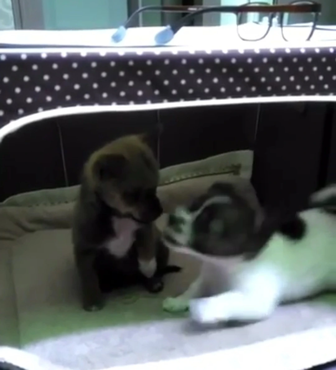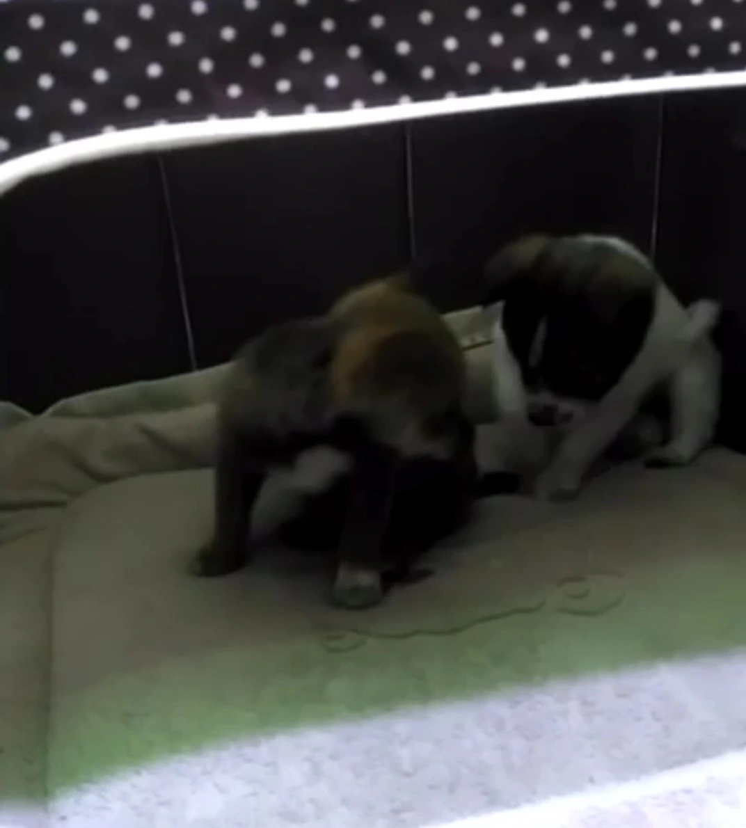 내가 2주 정도 먼저 데려왔던 암컷은 머리와 엉덩이, 등에 검정 털의 무늬가 있는 포동포동한 흰색 강아지였다.