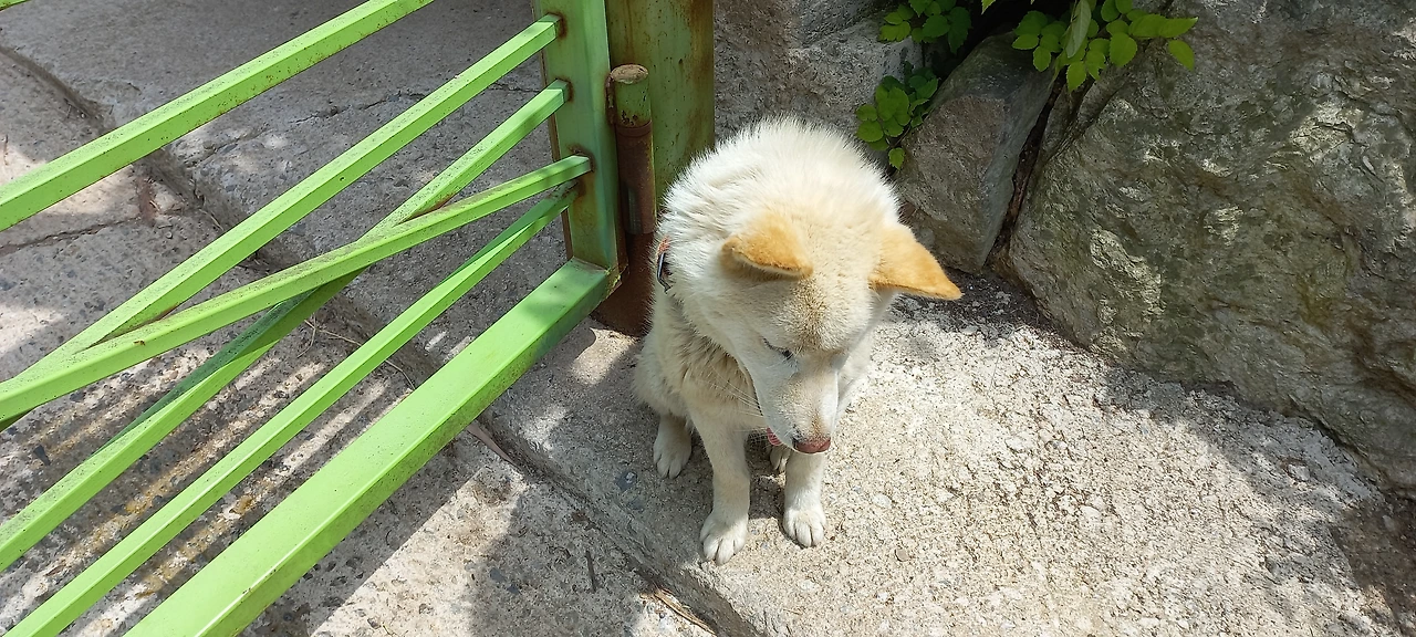 시간은 오전 11시가 넘었고 햇볕은 더욱 강렬했지만 그대로 집으로 들어가기엔 서운해서 흰둥이과 빼꼼이에게도 들렀다. 우리 집 단지의 정문으로 들어가 후문 지하 주차장 쪽으로 나가서 흰둥이에게 먼저 갔다. 여전히 김치찌개의 빨간 국물에 말아준 밥은 겉이 마른 채 먹지 않은 상태로 있었고 개집 주변엔 개똥이 수북했다.