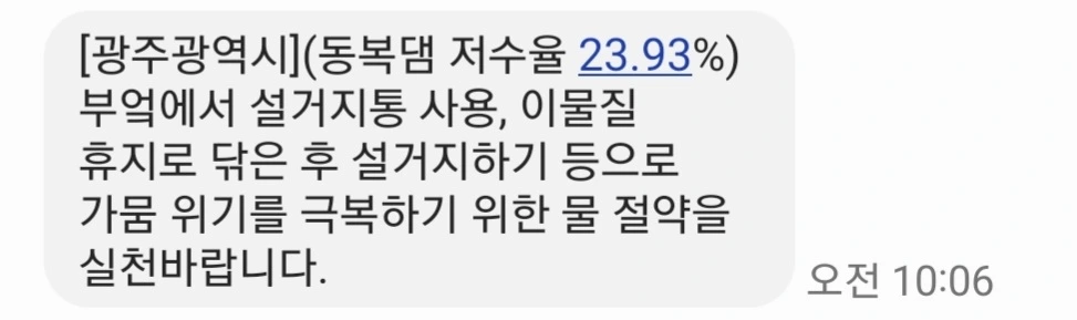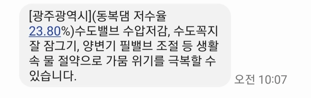 지인들에게 난 진심을 담아 말한다, 대한민국 사람들이 나처럼만 물을 아껴 쓴다면 이런 지경까지는 오지 않았을 것이라고. 때로는 웃으며 말한다, "네가 그렇게 물을 펑펑 쓰니까 저수지 물이 다 말랐지!"