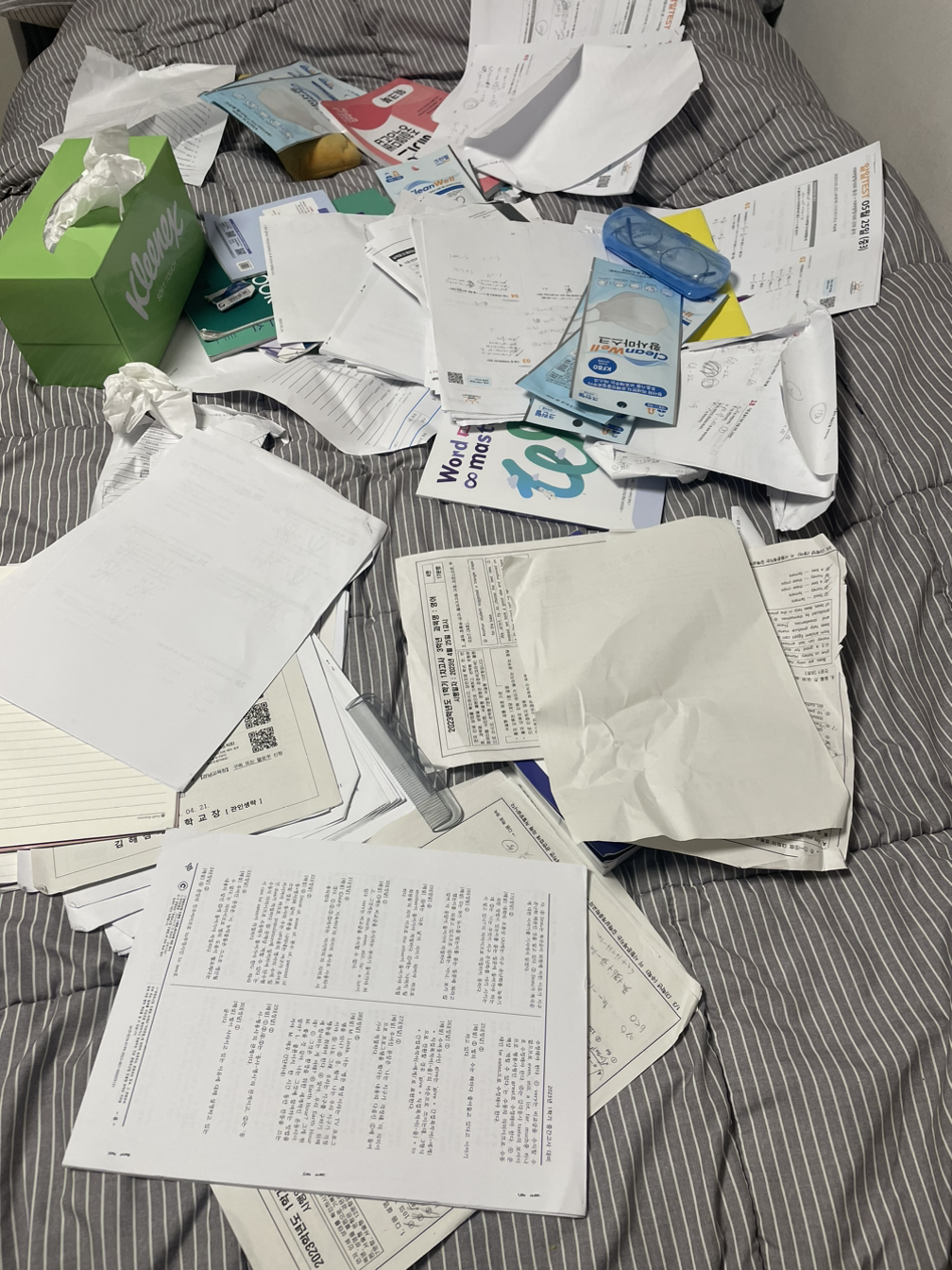바로 들고 나와서 확인해 보니 말한 그대로다. 거짓말은 없다. 쭉 훑어보다가 할 말이 남아서 아들 방에 노크 후 다시 들어갔다. 깜짝 놀랐다. 가방 안에 든 학원 문제풀이 복사지와 연습장, 양말 3짝 , 필통, 안경, 빗, 시험문제지들이 나에게 반항하듯이 펼쳐져 있다.