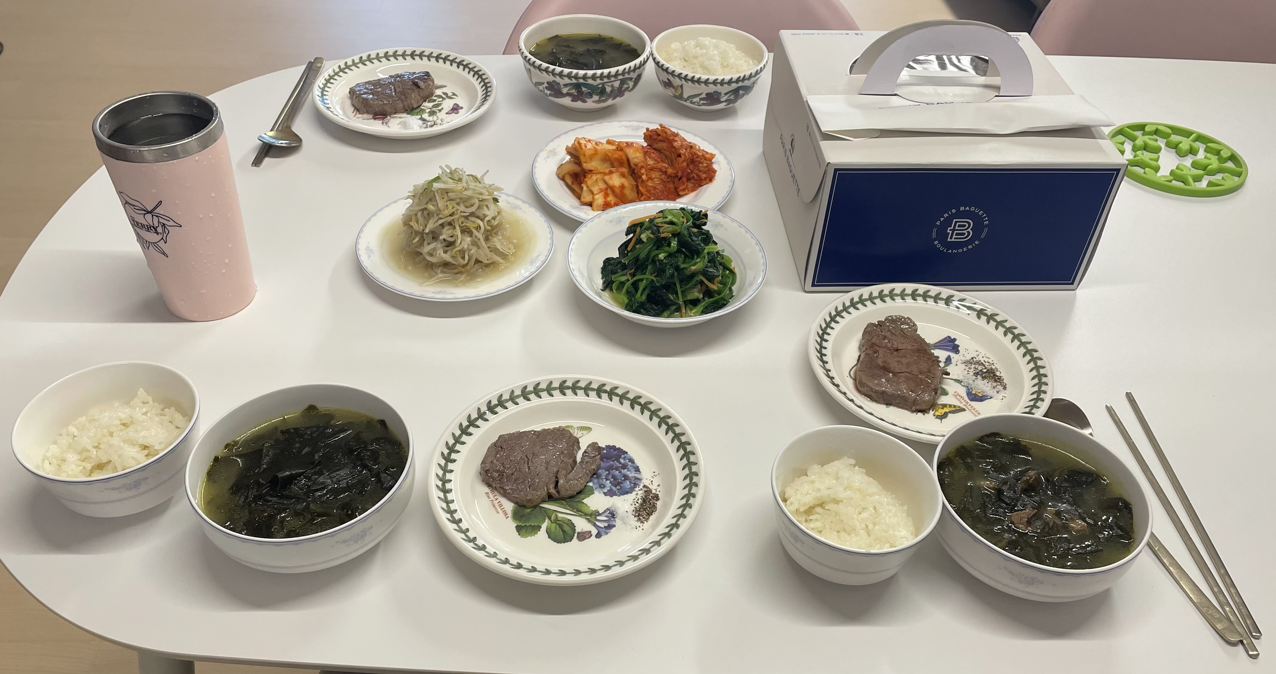 오늘은 늦잠을 자게 한 뒤 일찍 마트에 걸어가서 재료를 사 왔다. 숙주와 시금치나물을 했다.(여드름에 도움이 될까 해서.) 뭐 먹고 싶냐고 물으니 O사에 토마호크 스테이크가 먹고 싶다고 했다.(너무 비싸다...) 그래서 그냥 식육점에 가서 한우 등심 부위를 사 와서 구웠다. 생일케이크에 불을 켜고 생일 축하 노래를 불러줬다.