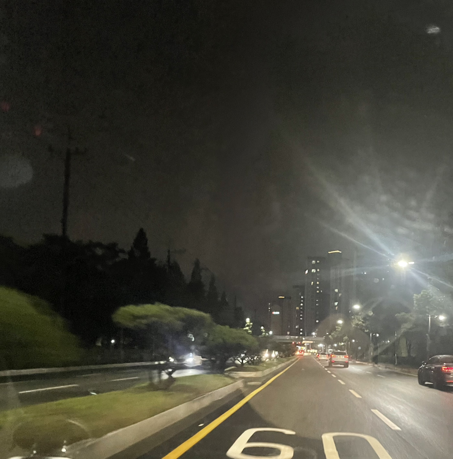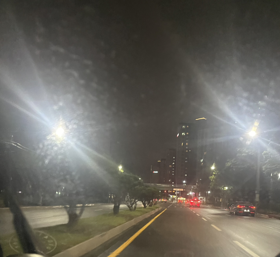 비가 많이 잦아들고 빗속에 전조등이 빠알간 석류빛을 반사하고 있었다.
