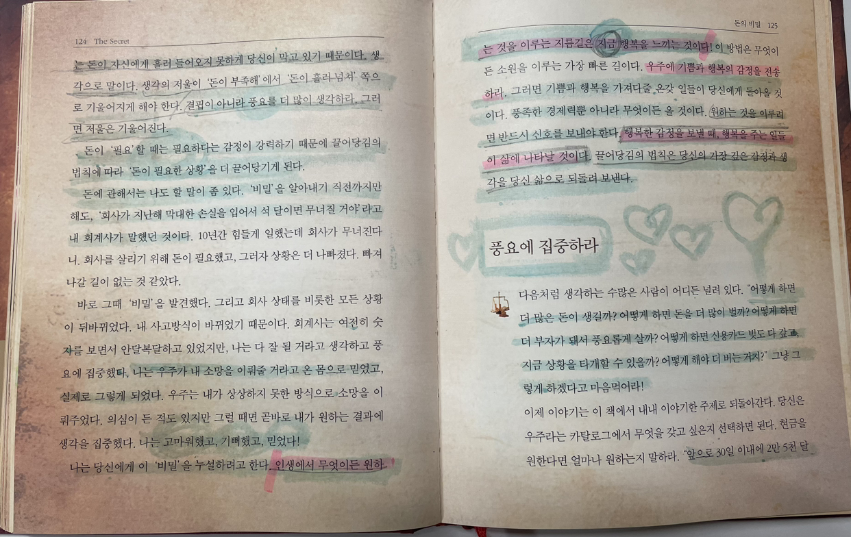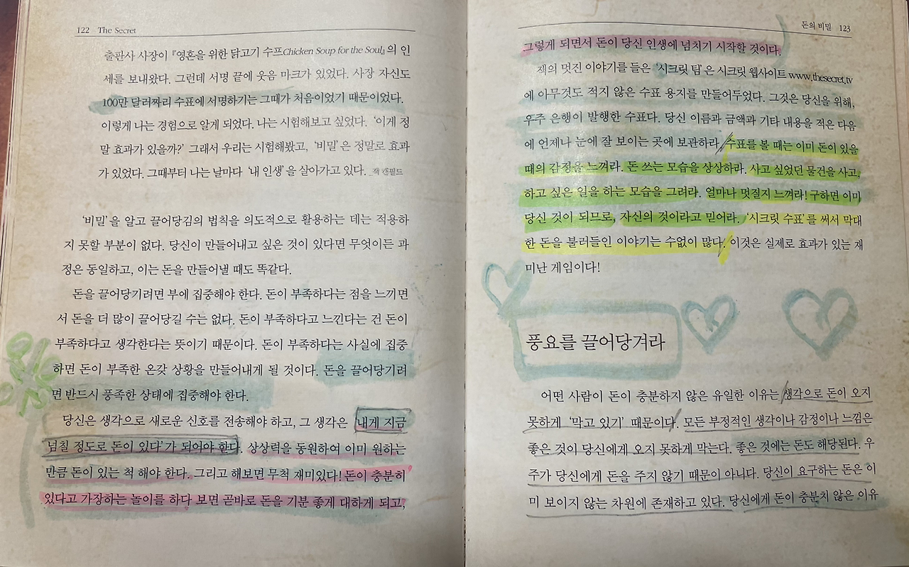 참 다행인 것이 여름휴가 시즌이어서 내가 혼자서 종일 도서관에 처박혀 있어도 아무도 이상하게 쳐다보지 않았다. 다만 저 여자 휴가가 참 길구나 했겠지. 온통 다른 사람의 시선이 의식이 되었지만 책을 읽으며 살아남았다. 나는 자기 계발서류의 책을 잘 읽지 않는다. 그러나 그때의 나는 이 책에 꽂혔다. 책을 읽고 또 읽고 물에 갈아서 다시 마실 정도로 몇 페이지를 펴면 어떤 내용이 나올 지도 상상을 하면서 읽어댔다.
