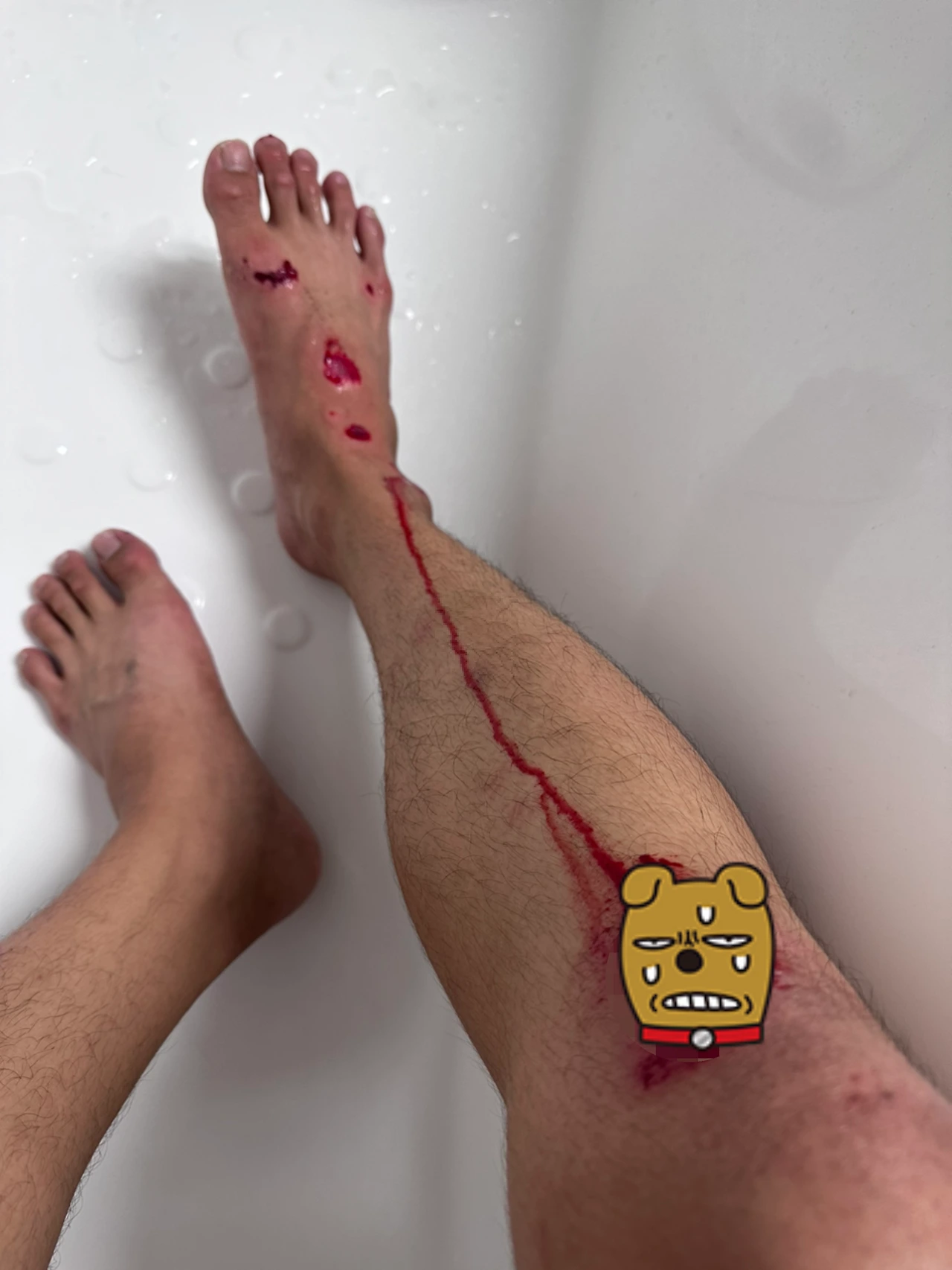 사진 속은 나의 아들이고, 무릎 부위에 찍히고 피가 많이 나고 발등도 긁혀서 아래로 피가 흘러내리고 있었다.