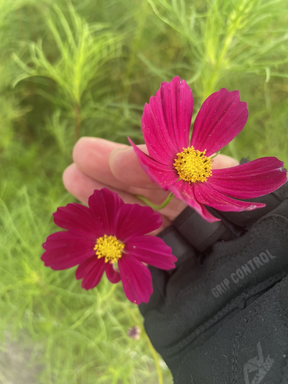 나이가 들어서일까. 요즘은 자꾸 멈칫거리면서 몸을 사리는 나를 보게 된다. 이것도 호르몬 분비랑 관련이 있는 걸까. 덜 공격적인 사람으로 변해간다. 달릴 때는 머리를 비우고 생각을 하지 않지만, 차가 자전거 옆을 지나가면 차를 세우고, (예전에는 같이 달리다가 옆 수풀에 처박히기도 했다.) 조금 위험하다 싶으면 멈춰서 기다렸다 갔다. 그래도 그렇게 탔어도 갈비뼈 골절 2번이 다다. 긁힌 적은 아주 많지만. 코스모스와 강아지풀이 많이 웃자라 내 허리까지 올라오기도 했다. 비만 먹고 저렇게 쑥쑥 자라나는 식물들이 오늘따라 다르게 보인다. 코스모스가 이뻐서 일부러 멈췄다. 바람에 흔들리는 마음을 잡기라도 하듯이 양손가락에 끼워 사진도 찍어 본다. 대봉감도 길 옆에서 영글어 간다. 서서 주위를 둘러보고 아들에게 빼앗긴 속도계를 아쉬워하며 있는 힘껏 질주해 본다. 아마도 최고 속도가 나왔을 듯하다.