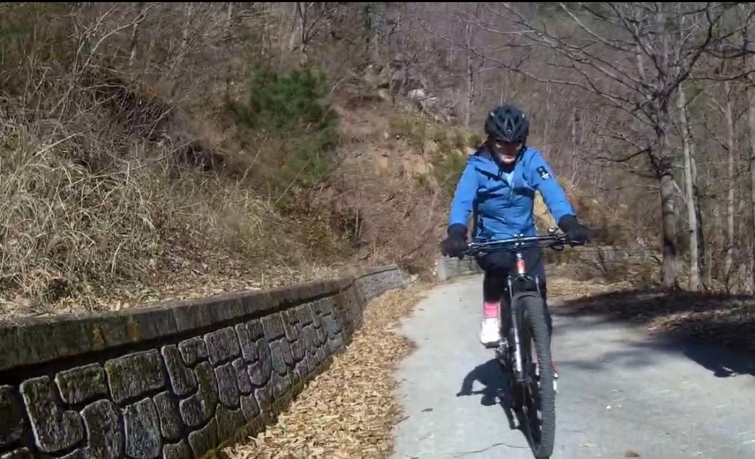 응달은 아직 눈이 녹지 않아서 약간은 미끄러웠고 양지에서 가을이 깊어가는 것을 다시 한번 느꼈다. 아무 소리도 들리지 않고 오직 자갈길과 자전거 달리는 소리만 들리는 산길의 라이딩은 정말 힐링의 순간이었다. 이 순간만큼은 아무 생각도 나지 않는다. 조금 멀리 바라보면서 다시 오르막이 나타나니 기어 조정을 어떻게 해야지. 오르막이 지나 잠시 낮은 경사로 오를 때는 허벅지 근육을 쉬게 하기 위해 다시 기어를 올려야지. 눈이 왔네. 앞에 돌이 있네. 언제 정상이 나올까. 대충 요런 단순한 생각만 하면서 올랐다. 밴드에 누군가 업힐에서 자전거 뒤에 설치한 카메라로 내가 천천히 호흡조절하면서(입술을 오므리고 숨을 내뱉고) 달리는 7분이 넘는 영상이 올라왔다. 올 한 해 내게 주는 최고의 선물이다. 이번 라이딩을 통해 산길을 자전거로 달리는 참맛을 알아 버렸다.(물론 도로포장이 안된 길은 많지는 않았지만 꾸준한 경사로 산을 오르는 것이다.)