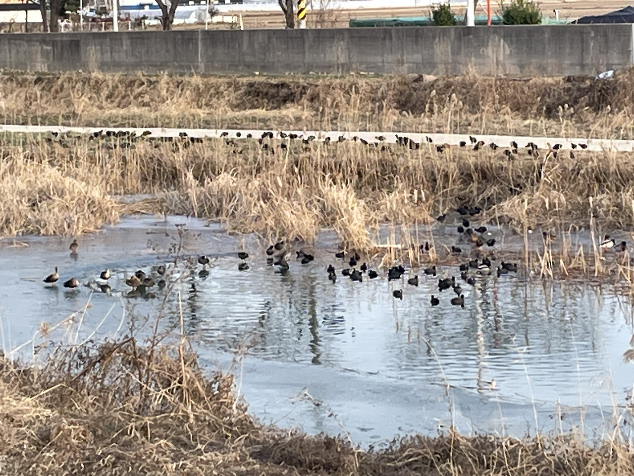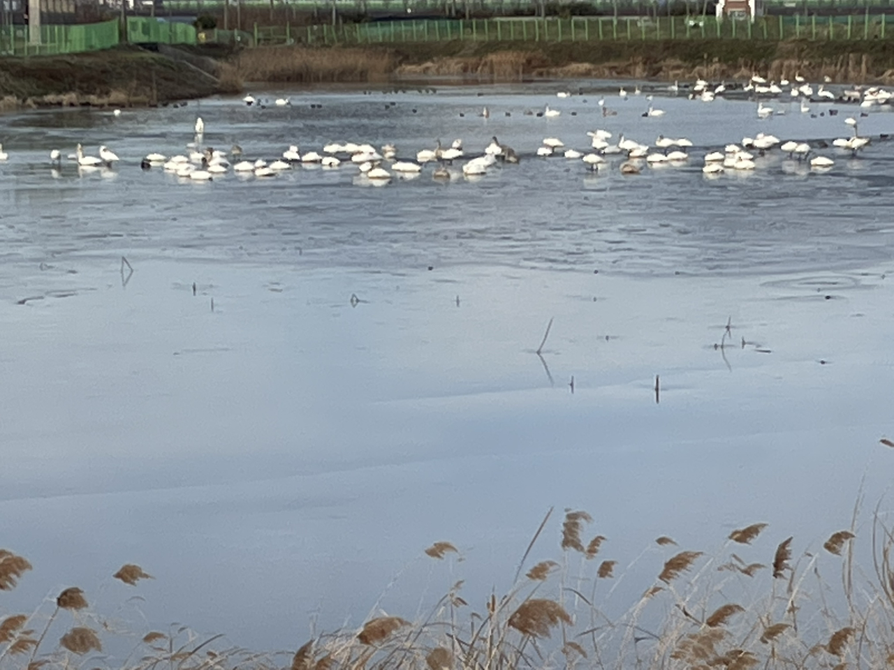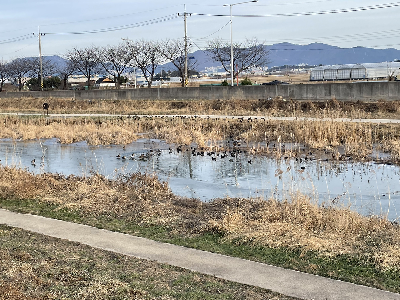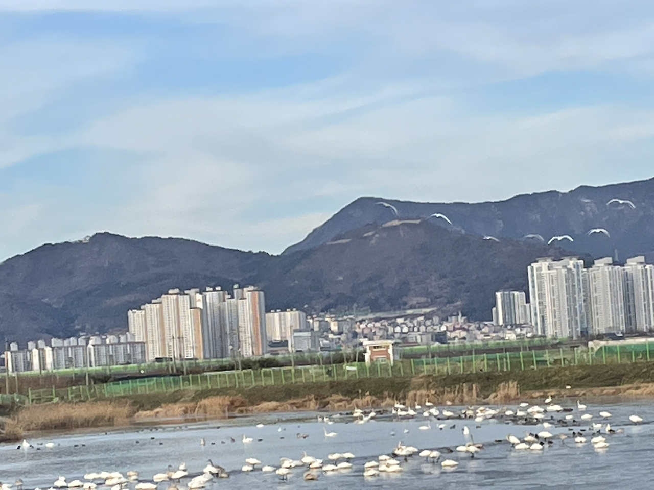 이전 같으면 날쌘 돌이처럼 무거운 몸이 사뿐히 나를 듯이 달릴 텐데. 오늘은 그럴 수 있는 날은 아니었다. 더 좋은 자전거로, 완전 평지에, 낮에 달리는 데도 그동안 쉰 시간들이 호사에 감사하는 마음마저 앗아갔다. 추위 때문인지 나처럼 조금은 자전거에 미친 사람들만 끌고 나왔고, 서로를 알아보면서? 스쳐 지나갔다. 아무 사이도 아니지만. 혼자 타는 자전거지만 여전히 나를 반기는 것은 철새였다. 오늘도 서로 맞붙어서 오글거리는 소리를 내며 모여있었다. 날씨가 추워 호수가 얼어 버리니 공간이 좀 줄어든 느낌이 들었다. 알지도 못하는 철새들도 해반천에 모였다. 검은색으로 이번에 첨 보는 듯하다. 무리를 지어 있는 모습이 부럽기도 했다. 저 안에도 알력과 다툼이 있을까. 하얀 고니 위로 하늘을 무리 지어 나르는 철새도 있었다.