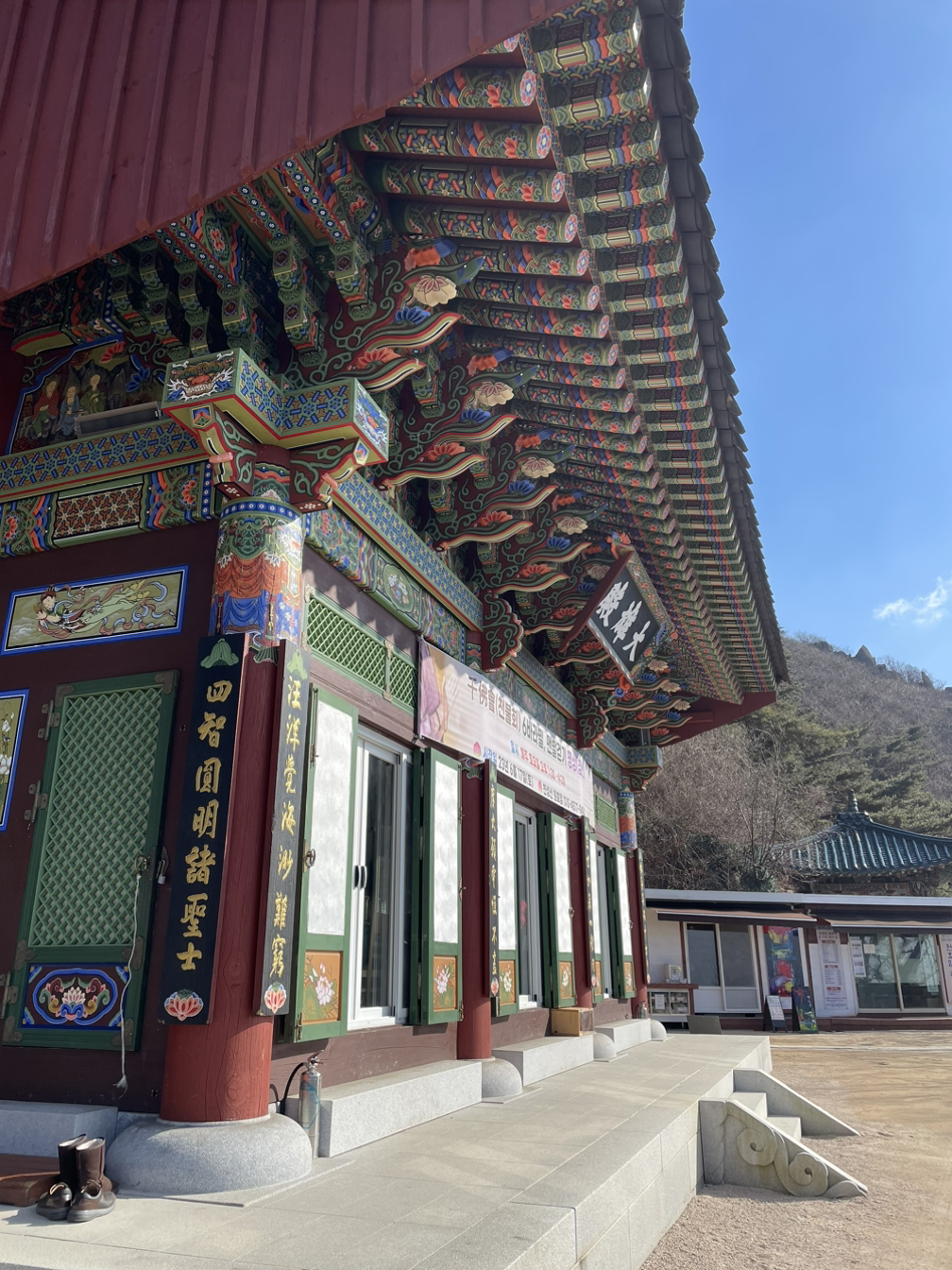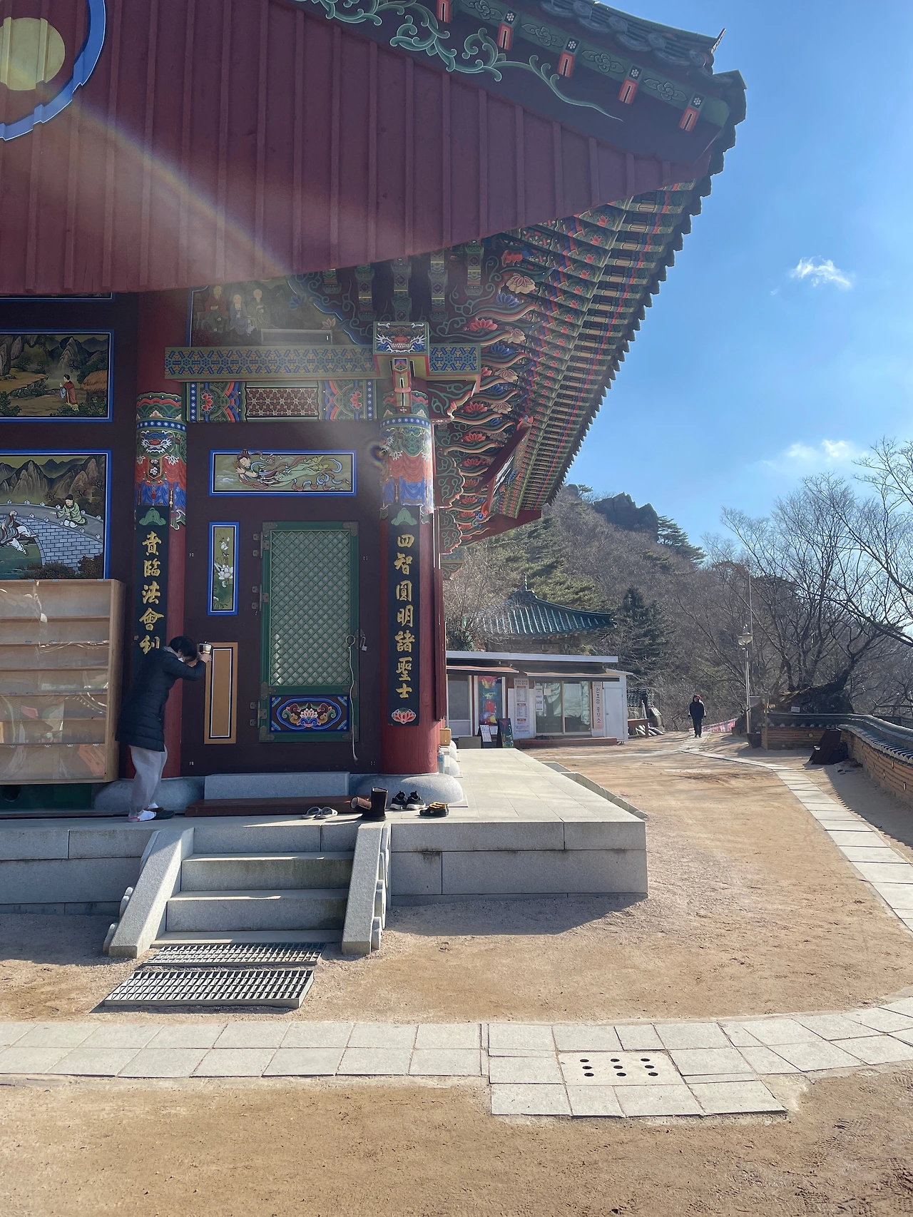 무언가 나무들 사이로 바위가 보이고 드디어 종착점이 보이기 시작한다. 원효암 입구 주차장에 도착했다. 왼쪽은 원효암 들어가는 입구이고 직진해서 위로 올라가면 천성산이다. 나는 원효암으로 들어갔다.
