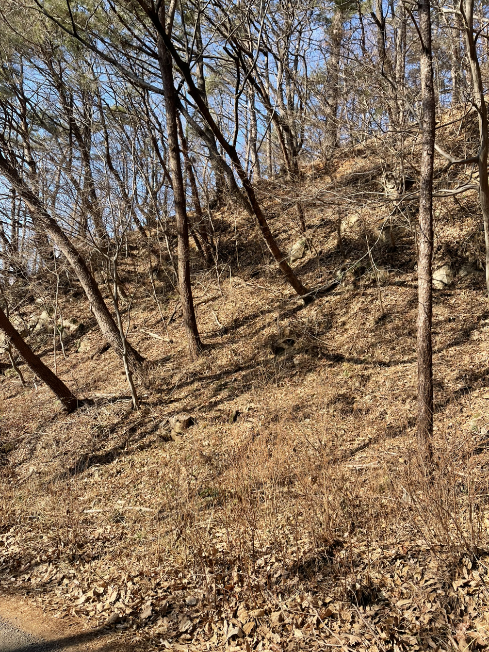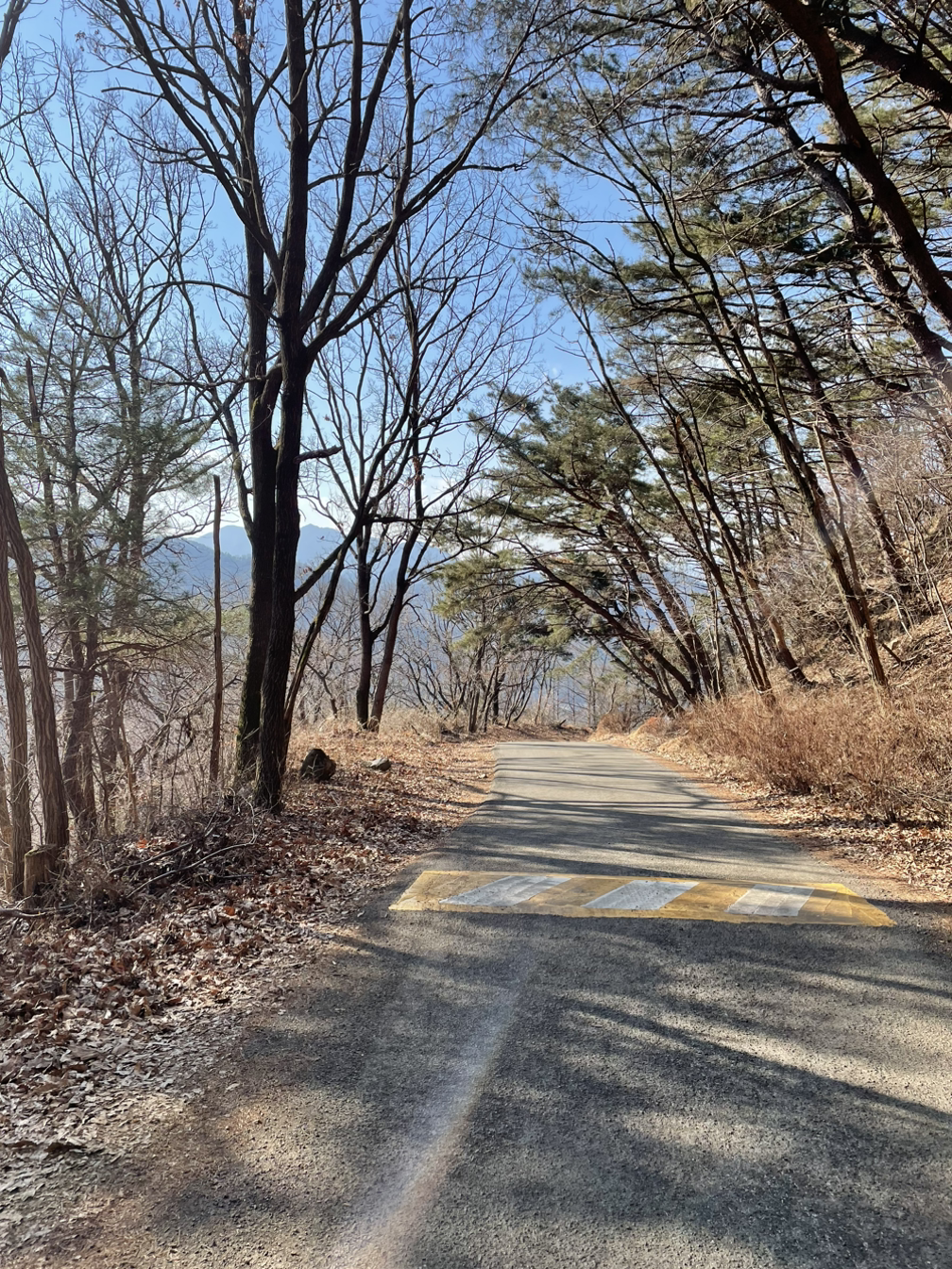 업힐이 엄청 세다고는 할 수 없는 도로였다. 내 기준에서 한 3곳을 제외하면 말이다. 문제는 자전거를 타면서 잘 닦여진 도로를 따라 산을 오르는 것이었다. 그런데... 돌아서면 다시 오르막... 숨 쉴 틈도 주지 않고 오르막이 계속되었다. 일요일이라 차량도 많이 올라갔다. 5분의 1도 안 간 초입에서 승용차가 내 옆으로 오는 것 같아 무서워서 한번 도로 밖으로 넘어졌다. 아무렇지도 않은 듯이 일어났다. 다시 잘 닦여진 도로 위를 올라갔다. 20명이나 되었지만 뒤에서 밀어주는 사람은 나밖에 없었다. 포기하고 끌고 가려는 순간 어디선가 베테랑님이 다가와서 밀어주셨다. 나는 죄송해서라도 열심히 페달링을 할 수밖에 없었다. 절반 고개쯤 갔을 때 도저히 안 되겠다고 쉬어 가자고 했다. 여름이면 우거진 숲이지만 겨울이라 앙상한 가지와 낙엽만이 수북이 쌓여있다.