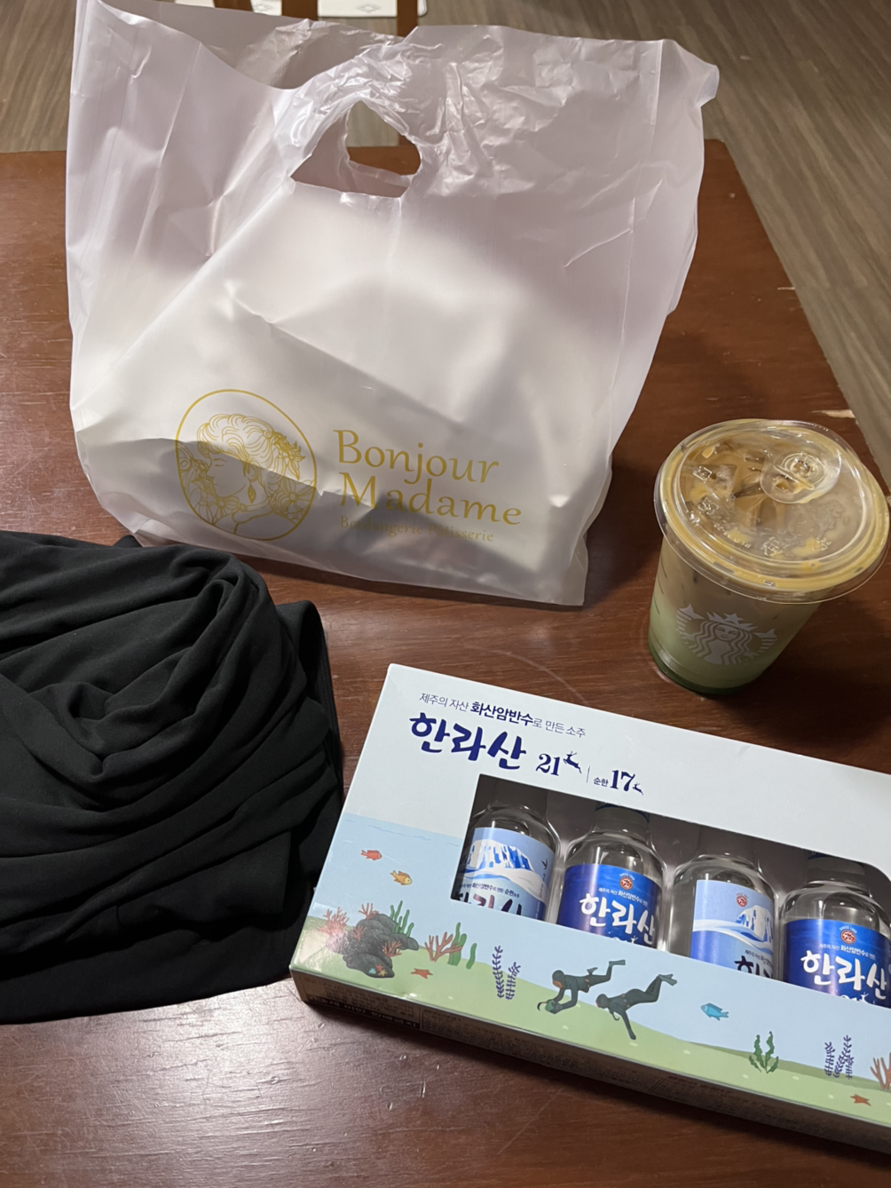 의외로 두 개뿐인 줄 알았는데 제주음료만 여섯 가지고, 빵이랑 샌드위치 등등 엄청 많더라. 그래서 그중 J가 생각나는 비자림 콜드 브루를 일단 테이크 아웃하여 (친구 E의 선물 카톡 쿠폰 사용) 이마트 봉투 안에 한라산으로 잘 야무지게 고정하여 세워서 빵이랑 같이 담아 버스를 탔다. 그 앞엔 울 숙소 근방에 오는 버스가 많이 지나다닌다.