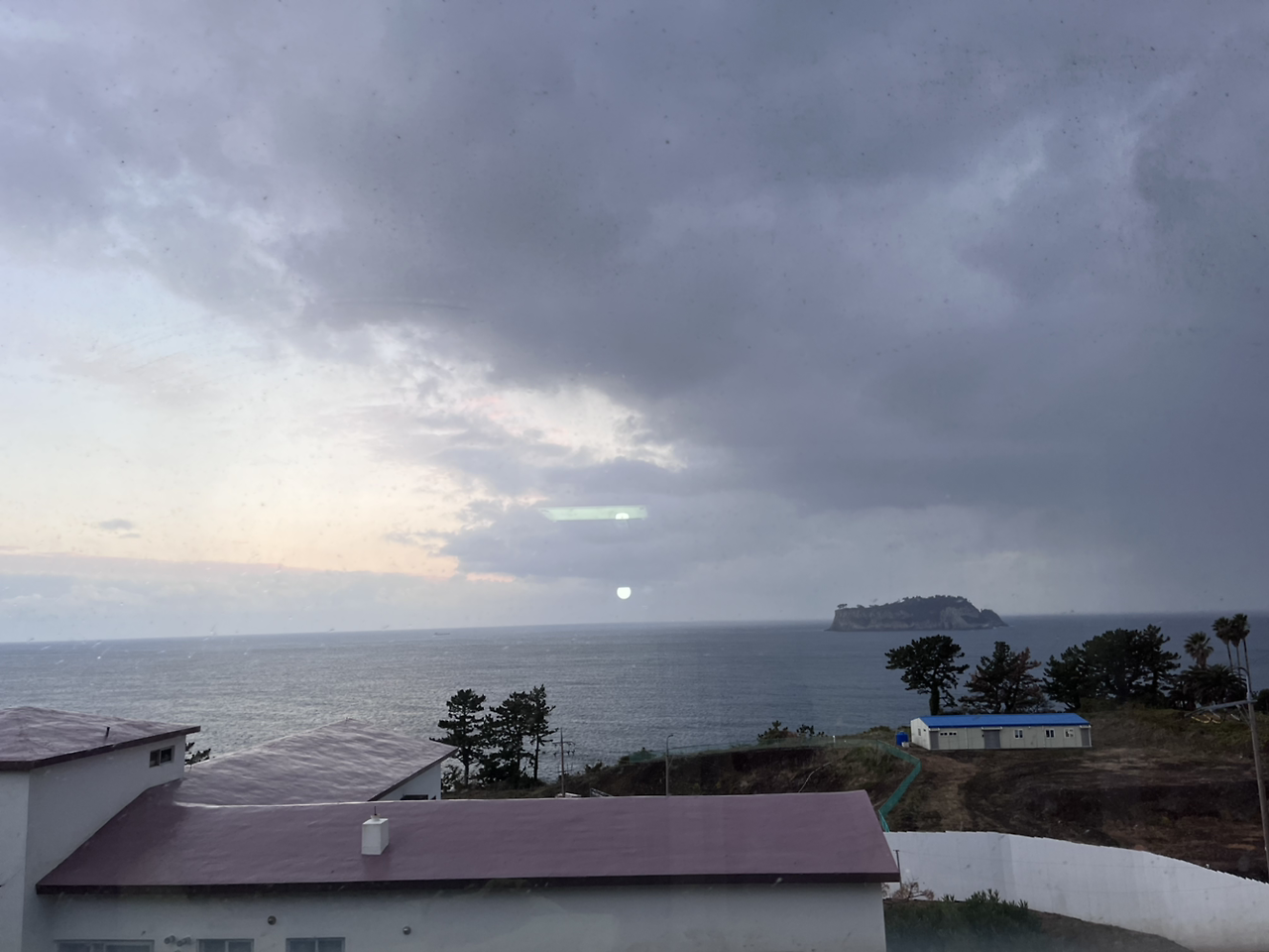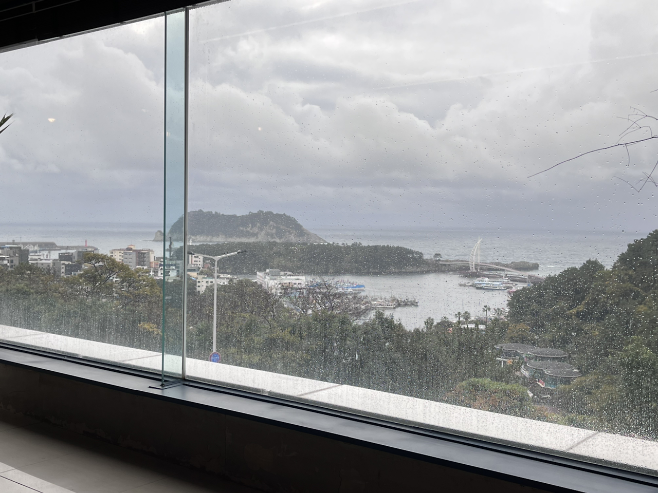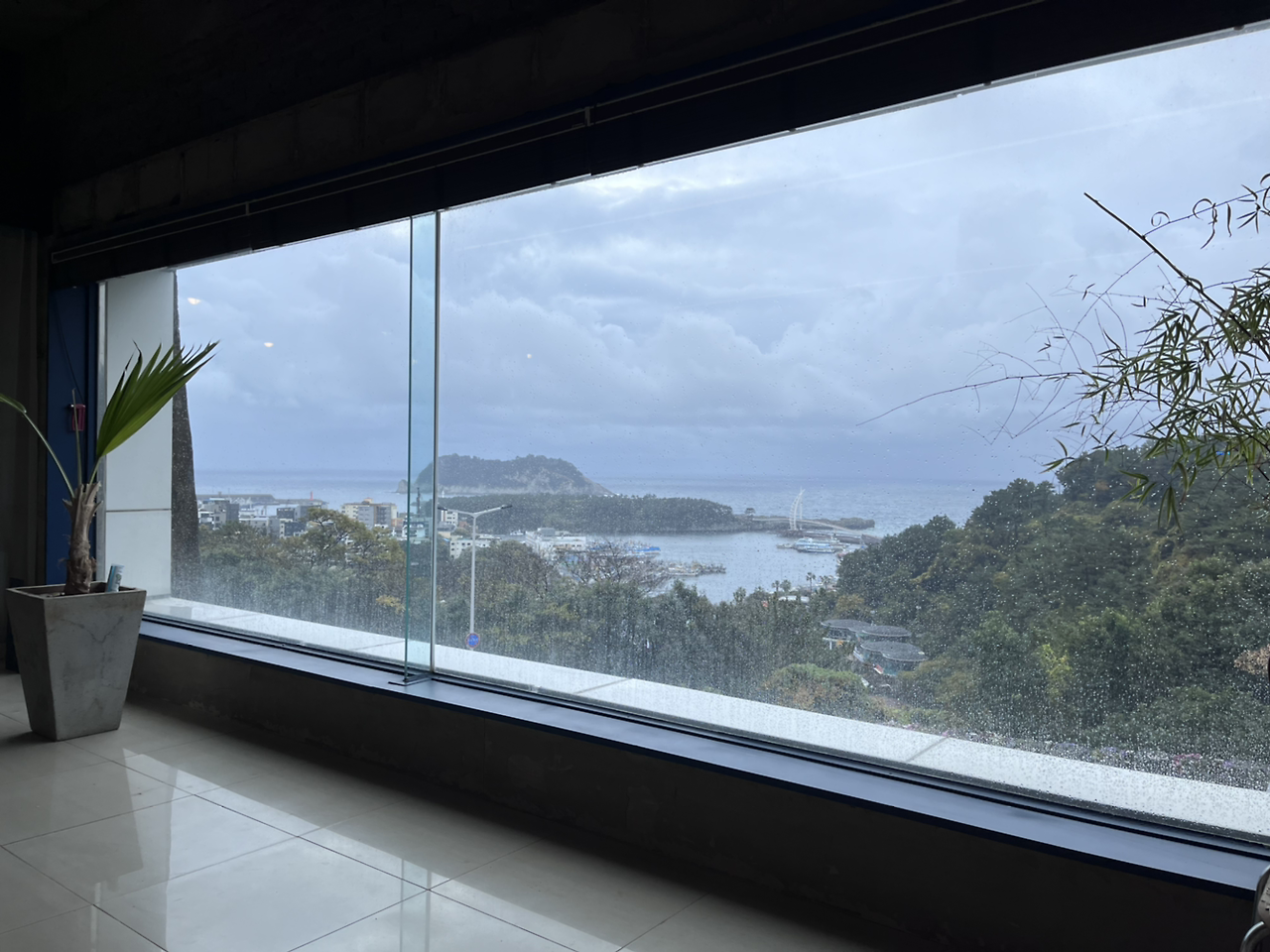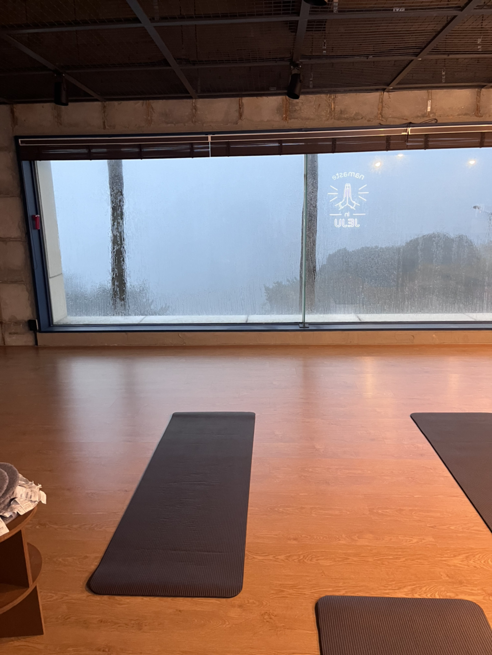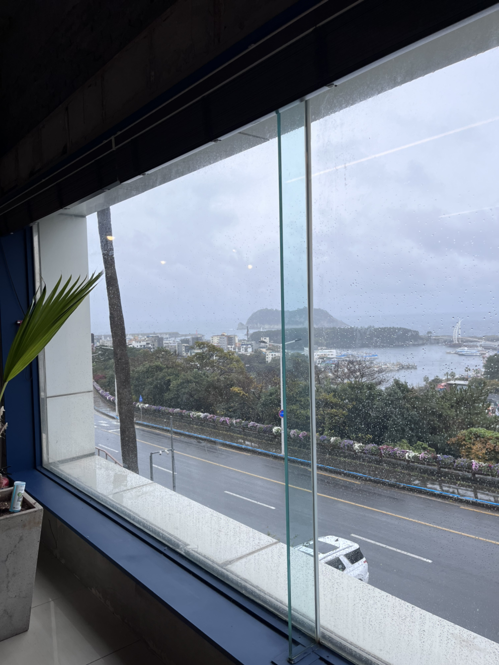 그래도 약 40분쯤엔 직원분이 오셔서 문을 열어줬다. 범섬이 보이는 바다 뷰 요가였는데 도착하자 비가 너무 미친 듯이 와서 아무것도 보이지 않았다 거의 폭풍의 언덕이었다.
