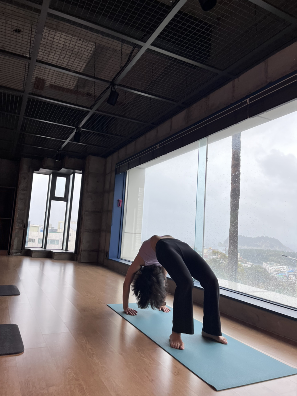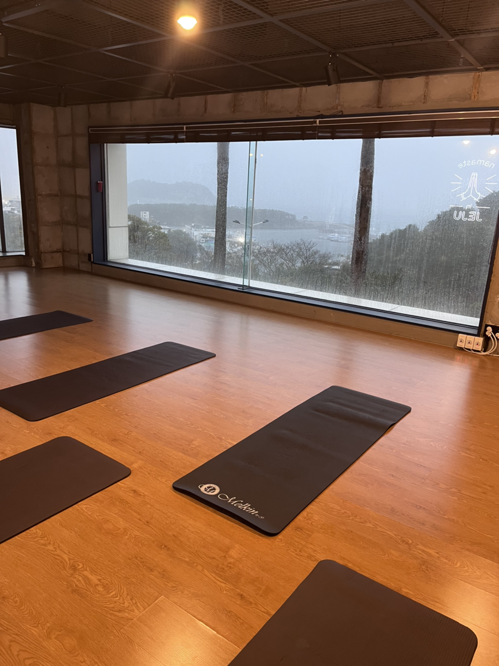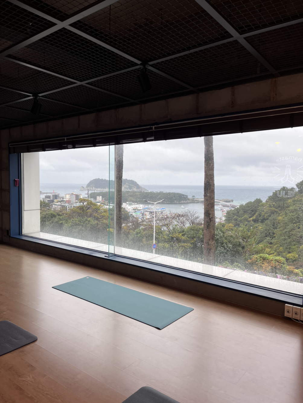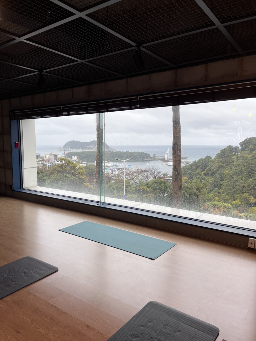 카페와 작은 요가 공간이 마련된 곳에 가서 사진을 찍고 몸을 풀고 있자 사람들이 한두 분 오시고 선생님도 오셔서 수업 시작을 했다. 총 6명이 하는 수업인데 친구들인 3분은 좀 나중에 오셨다. 비가 그렇게 오는데도 전원 참석! 그만큼 탐나고 인기 있는 수업이긴 했다. 12월은 거의 꽉 차 있었던 거 같기도 하고. 1번째로 도착한 덕분에 가장 뷰가 잘 보이는 뒷자리 맨 오른쪽을 선점. 범섬이 가장 잘 보이는 위치였다.