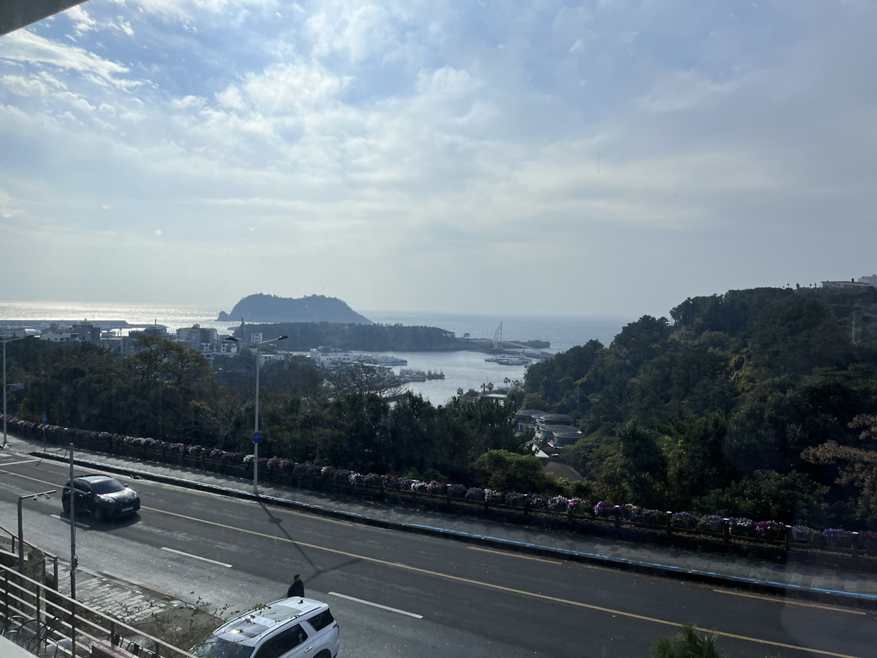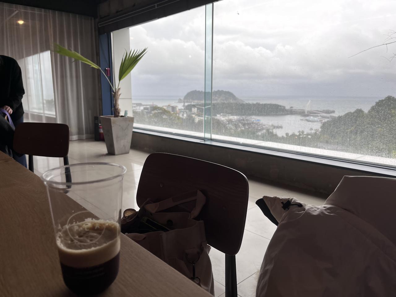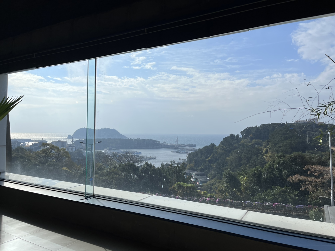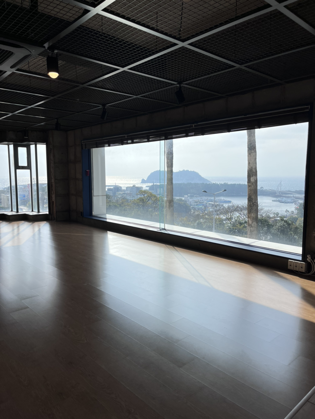 카페와 작은 요가 공간이 마련된 곳에 가서 사진을 찍고 몸을 풀고 있자 사람들이 한두 분 오시고 선생님도 오셔서 수업 시작을 했다. 총 6명이 하는 수업인데 친구들인 3분은 좀 나중에 오셨다. 비가 그렇게 오는데도 전원 참석! 그만큼 탐나고 인기 있는 수업이긴 했다. 12월은 거의 꽉 차 있었던 거 같기도 하고. 1번째로 도착한 덕분에 가장 뷰가 잘 보이는 뒷자리 맨 오른쪽을 선점. 범섬이 가장 잘 보이는 위치였다.