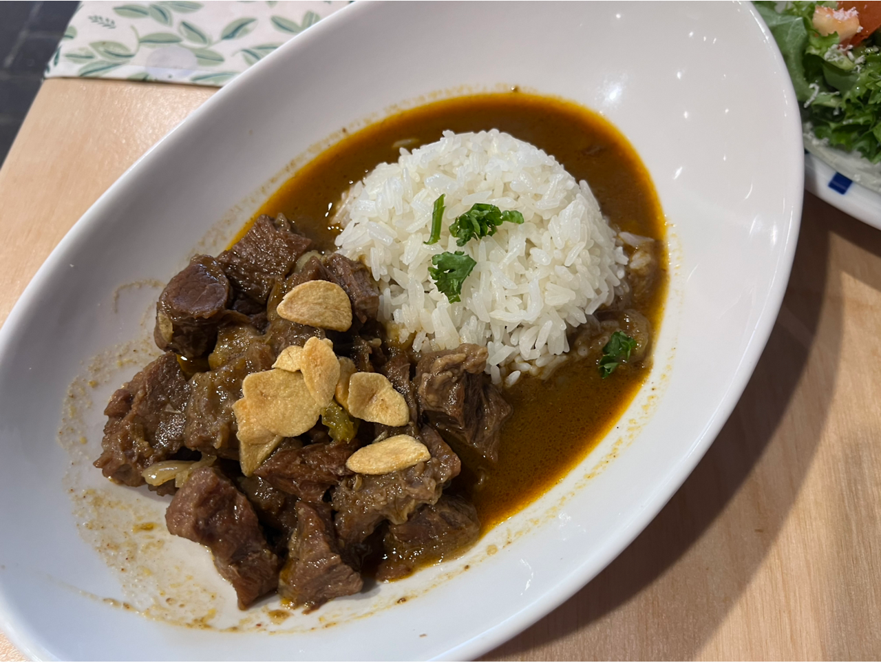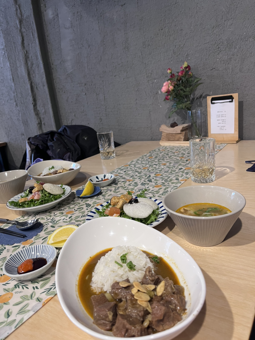 찾아간 세계 음식 식당은 내일부터 휴가이신데 우리가 간 날 딱 열어서 너무 뿌듯하고 맛있게 먹었다. 비바람을 맞아 따뜻한 게 끌렸는데 인도네이아식 가정식이라 쌀국수도 있고 코코넛 밀크가 들어간 부드러운 카레도 굉장히 맛있어서 다 먹었다. 멀티가 잘 안 되는 나이기 때문에 떠들면서 먹느라 좀 늦게 먹었다. 그분은 참 계획적이고 준비성이 좋으신 분이라 내가 역으로 좋은 정보를 많이 얻었다. 나도 다니면서 좋았던 카페를 소개해드렸지만. 그분이 정말 괜찮은 독립 서점도 추천해주셨다! 일단 밥을 다 먹고 후식인 코코넛 밀크와 젤리도 좀 먹고 가져온 어댑티브 오일을 그분께도 발라드리고 그분도 몹시 좋아하시며 오일 이름을 사진으로 찍어가셨다.