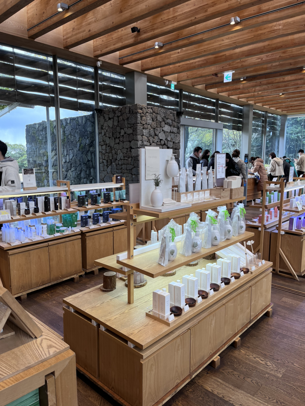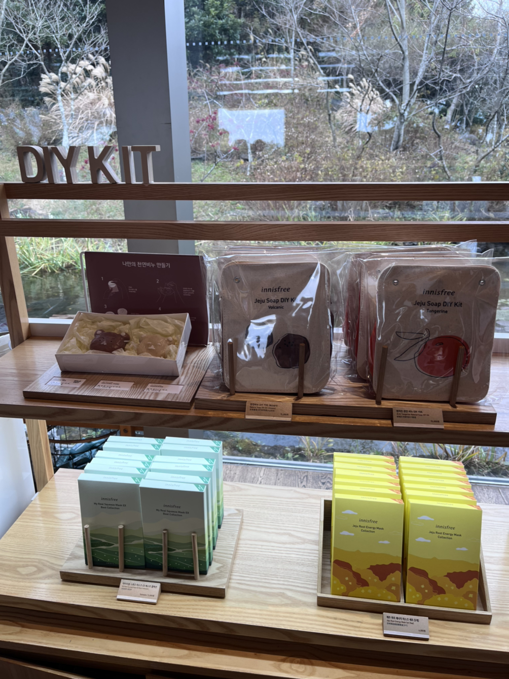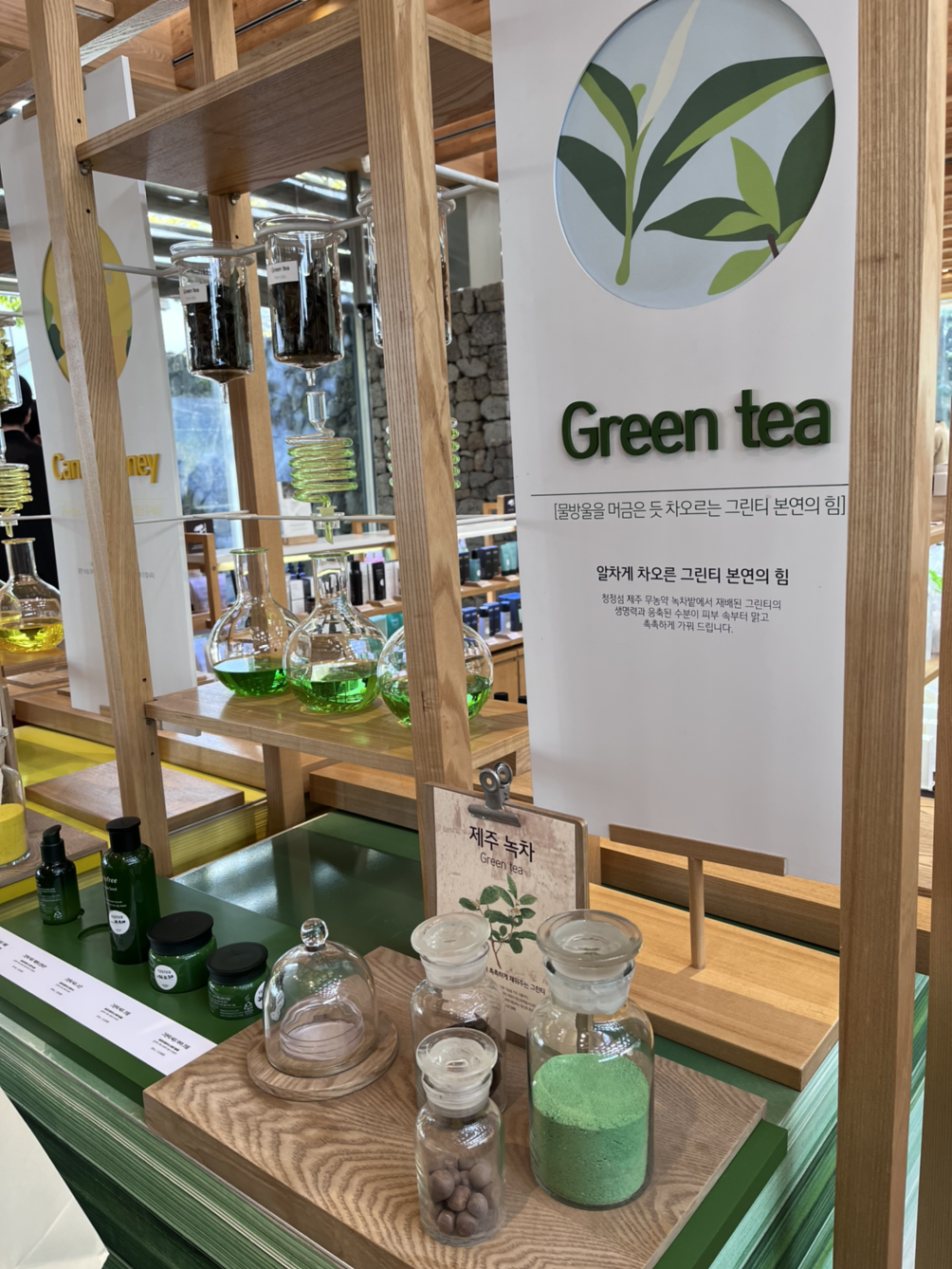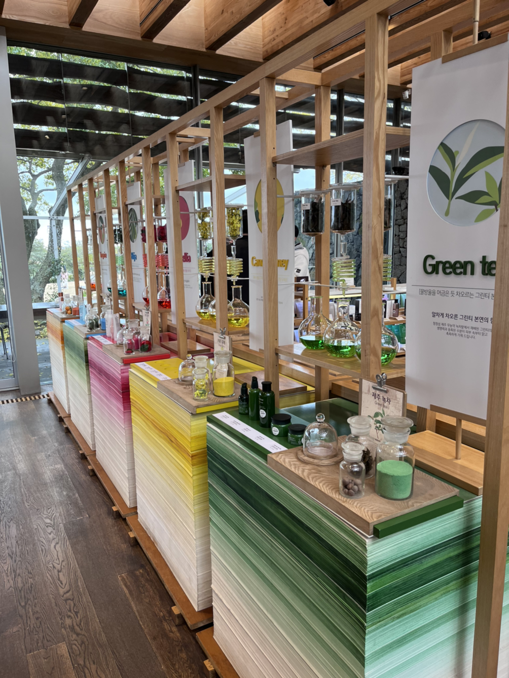 카페 옆의 판매대에선 다양한 제주산 재료로 만든 이니스프리 제품을 보기 좋게 전시하여 홍보하고 있다.