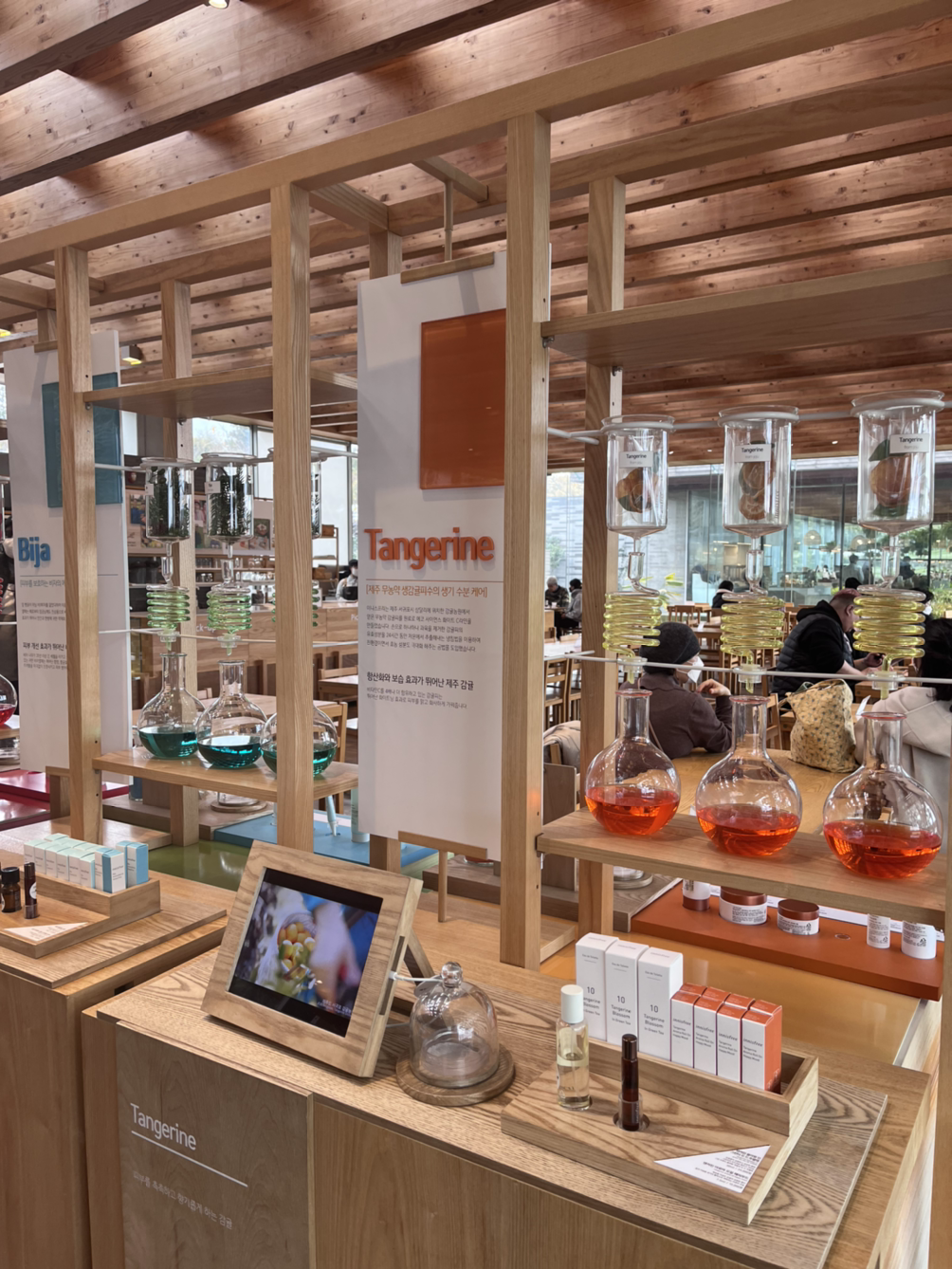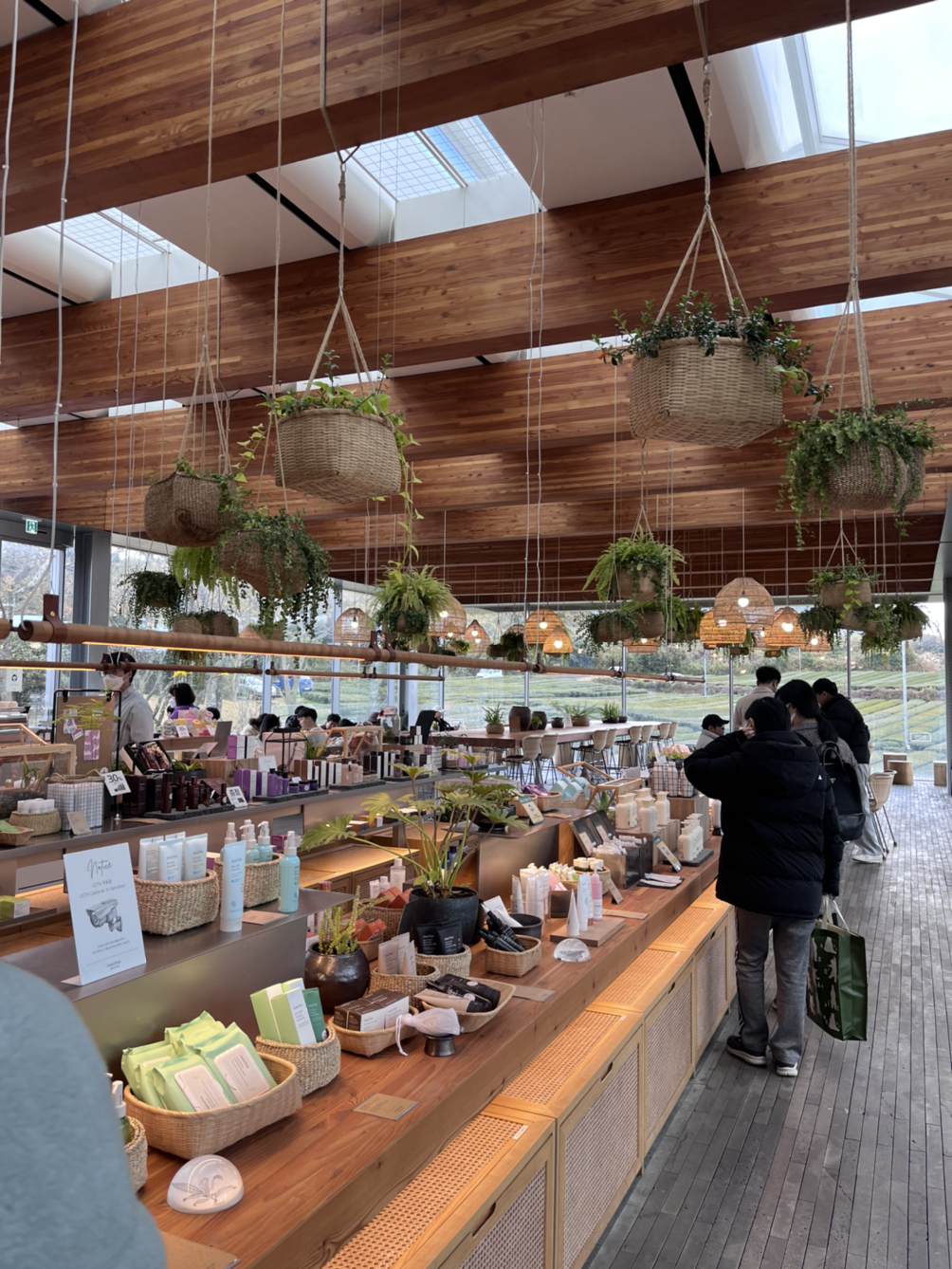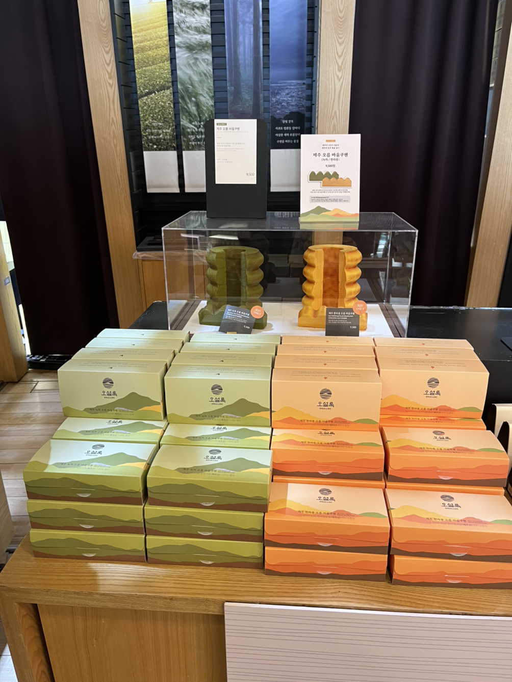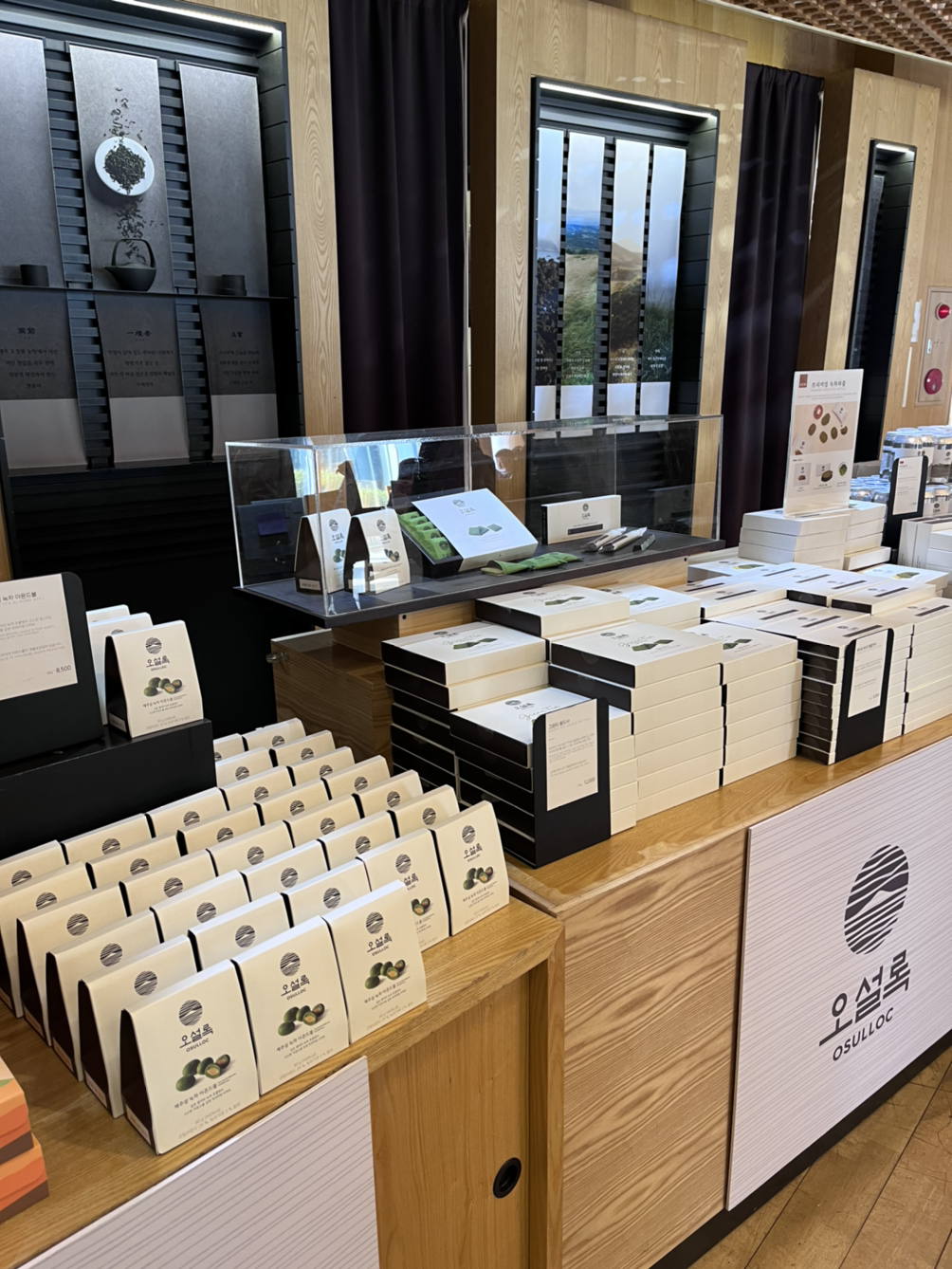 카페 옆의 판매대에선 다양한 제주산 재료로 만든 이니스프리 제품을 보기 좋게 전시하여 홍보하고 있다.